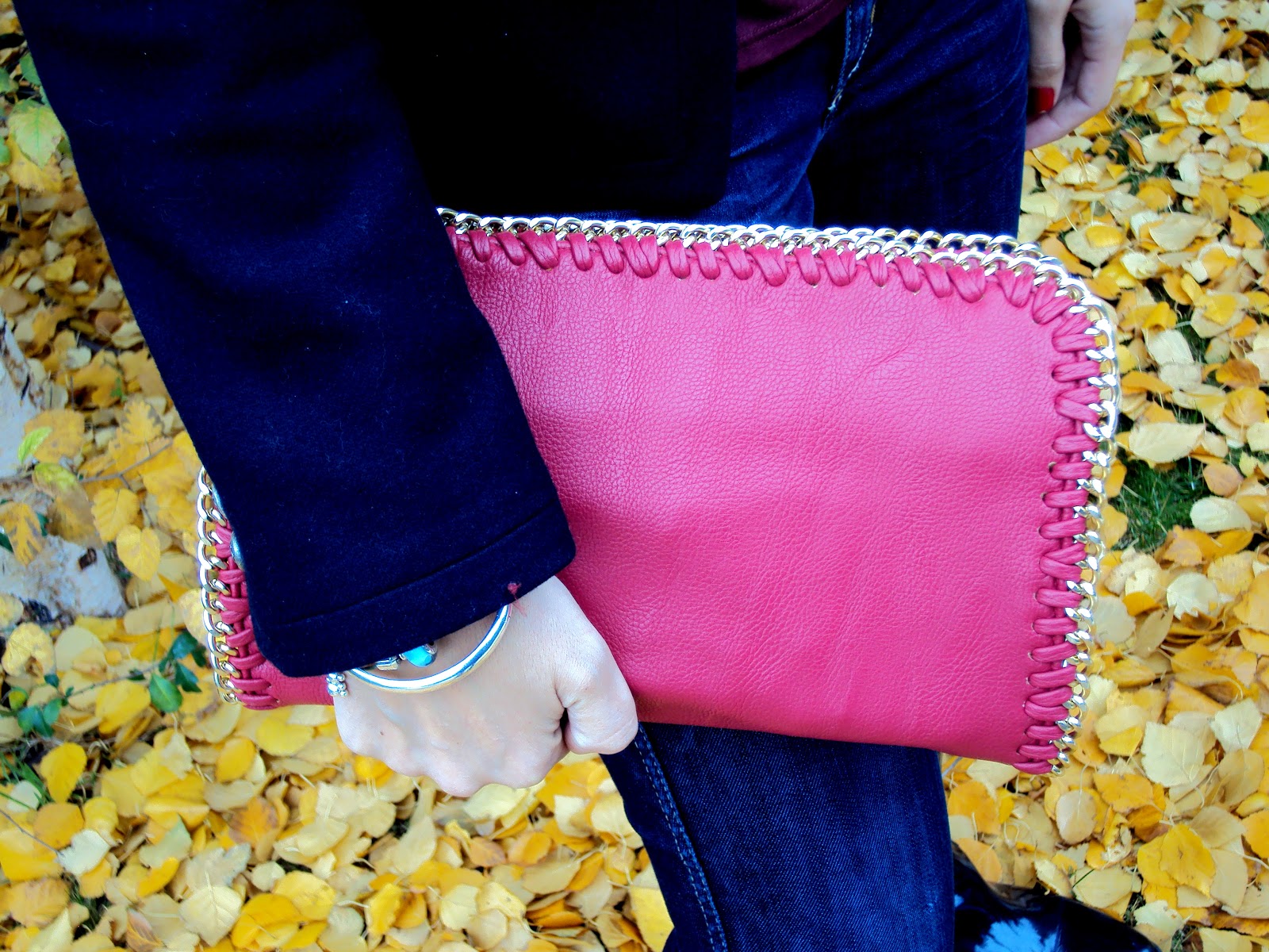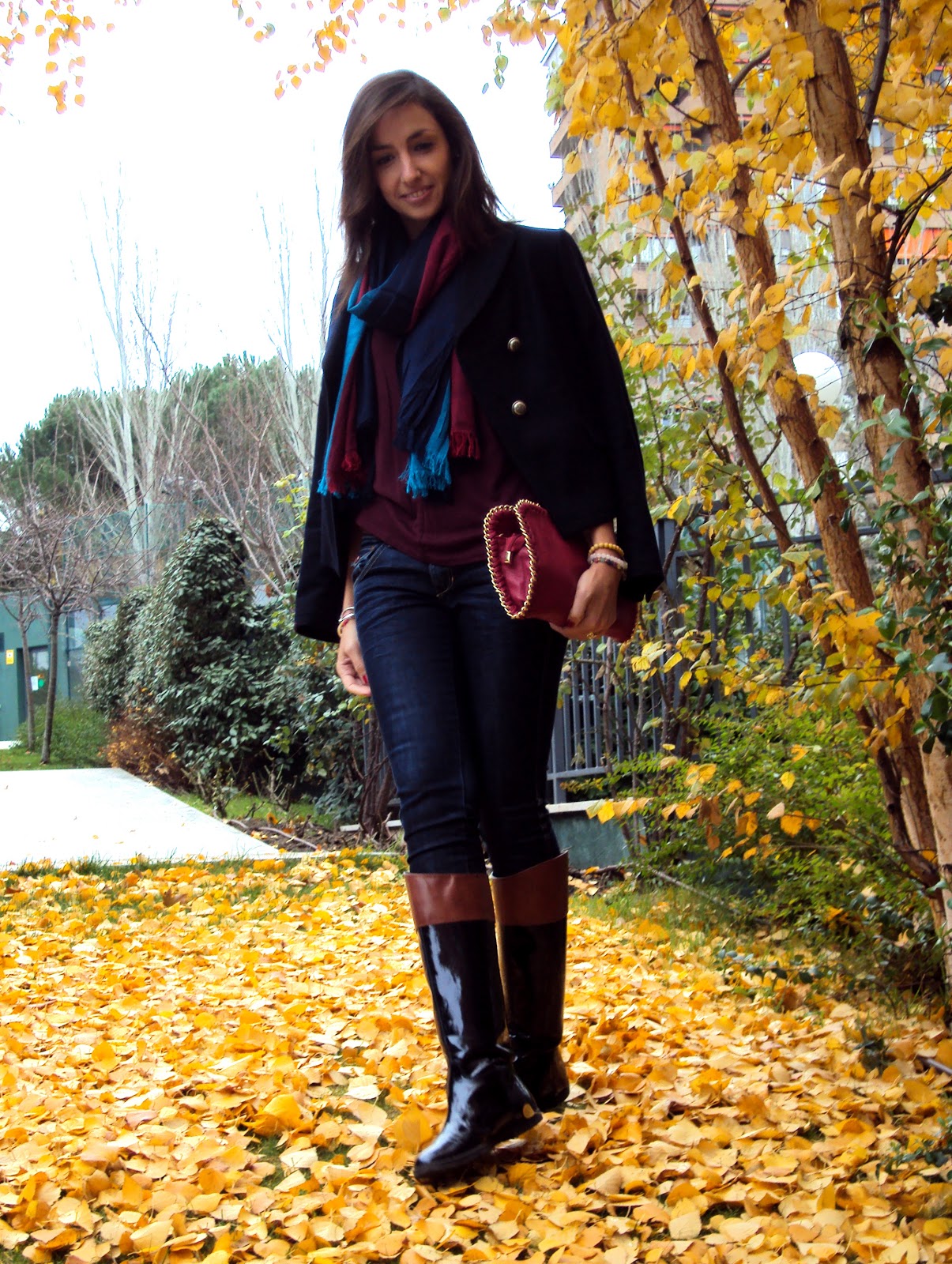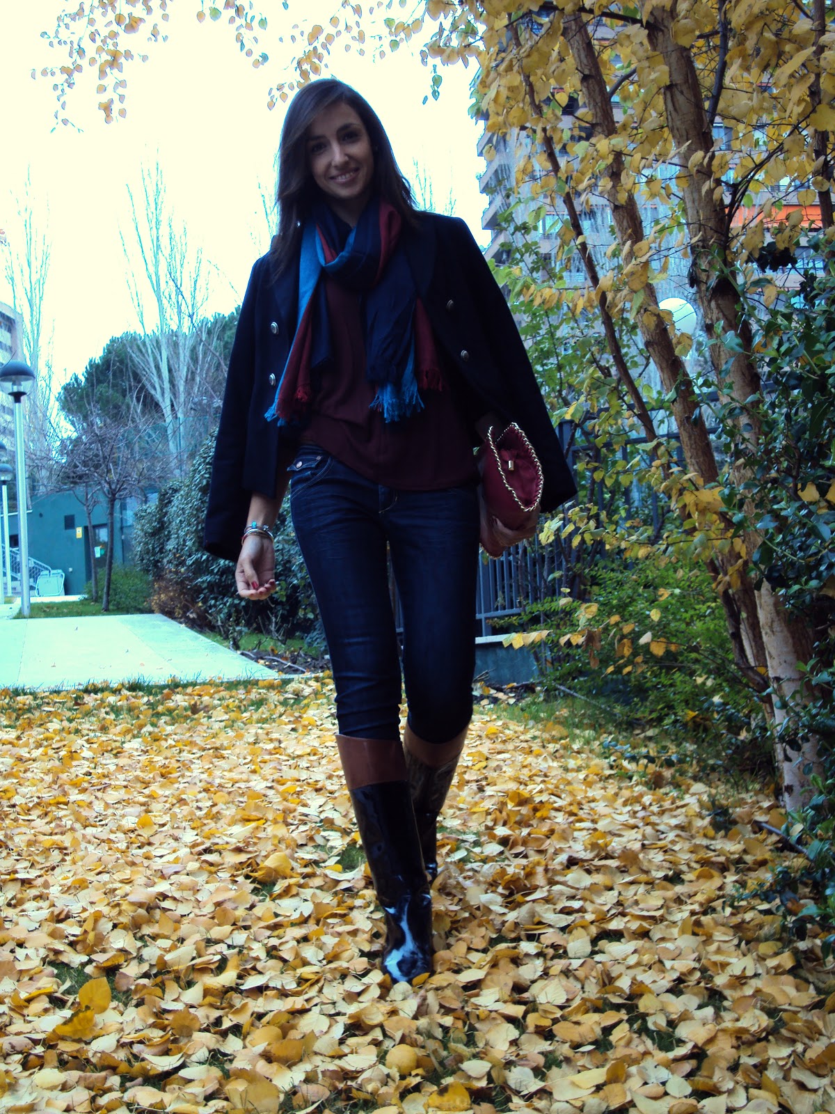 Hemos combinado para este outfit color marino y burdeos con complementos muy chic.