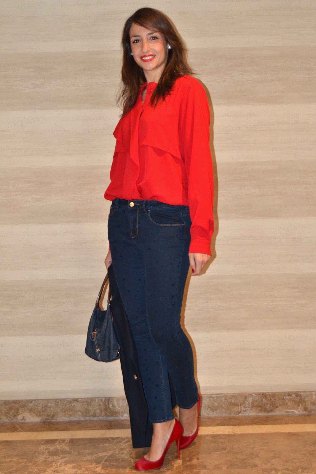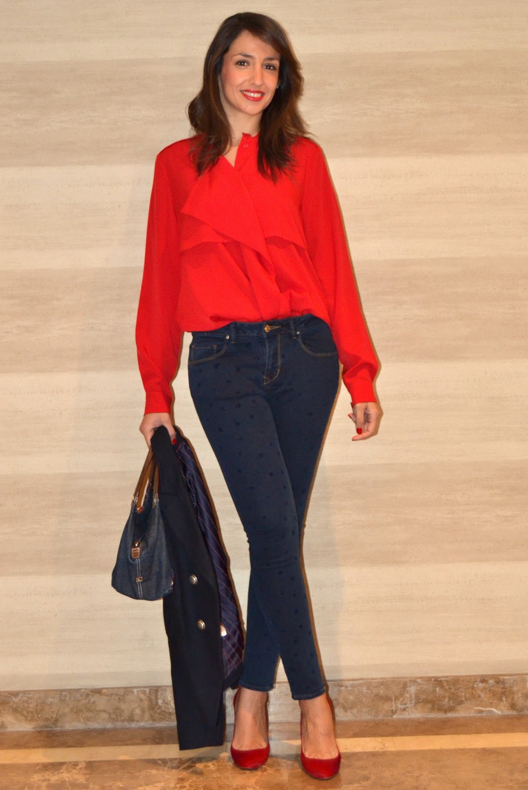 fabulosa blusa roja con unos vaqueros azules de pitillo con estampado de
