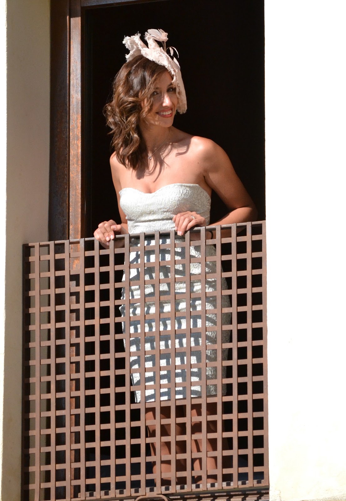 Al ser una boda en el mes de Mayo, en la provincia de Sevilla, y ademas iba a ser a medio día, presuponía que iba a hacer calor, y estaba en lo cierto… 30º a las 13:00h. Por lo que acerté al escoger el vestido, un tipo cóctel con escote palabra de honor con la espalda baja en tono gris perla. Para darle un poco de color escogí el tocado y los zapatos en color rosa palo. Quería llevar pamela pero me pareció demasiado por lo que me decanté por este espectacular tocado que también me cubría algo del sol.