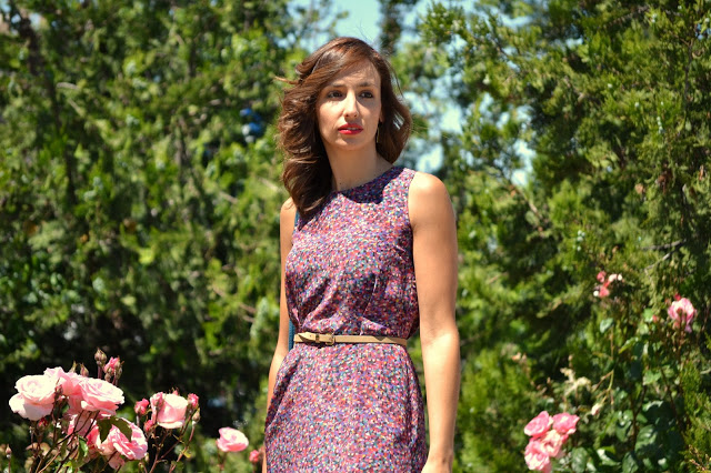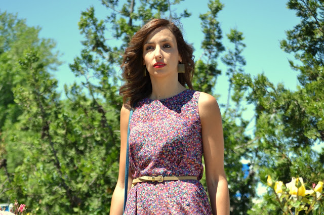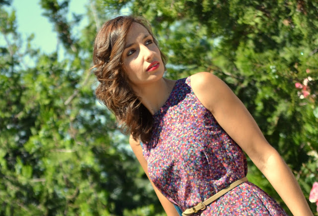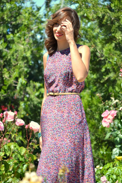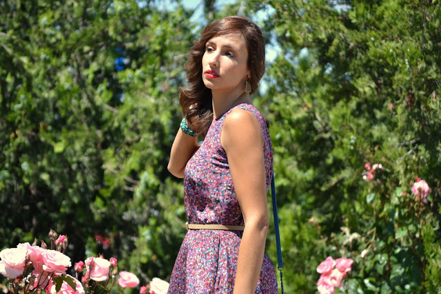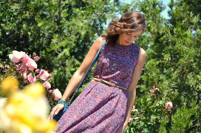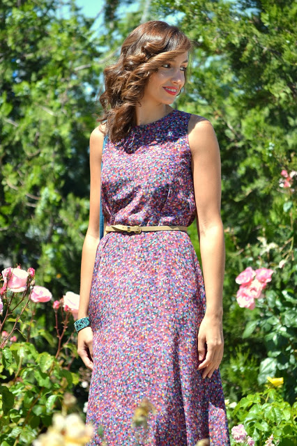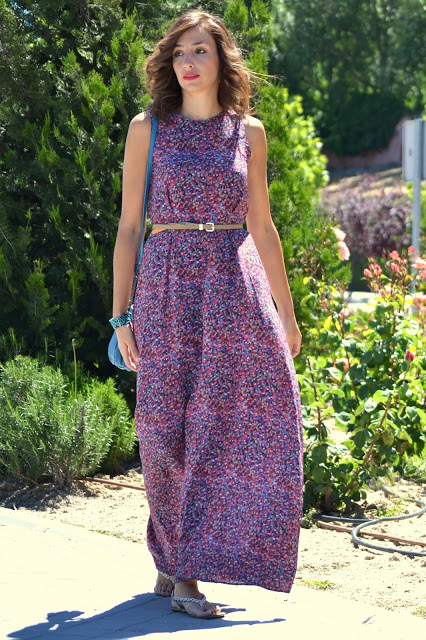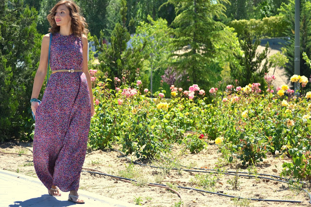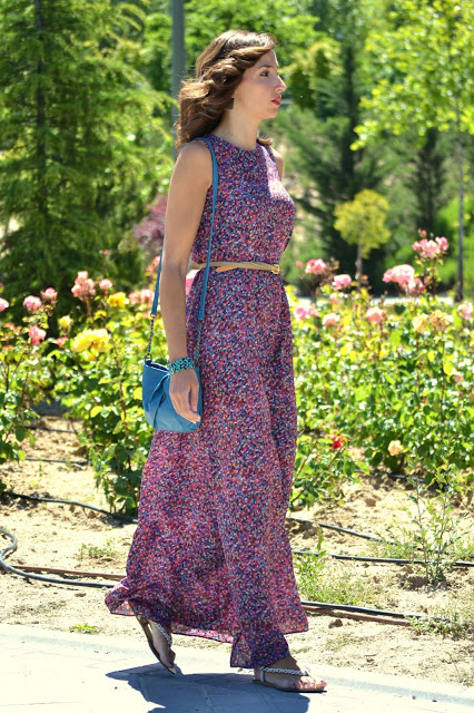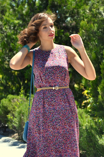 Como es de seda y muy vaporoso lo hemos entallado a la cintura con un fino cinturón, y como complementos no más que un little bag y unas sencillas sandalias para dejar todo el protagonismo a este precioso vestido.