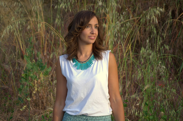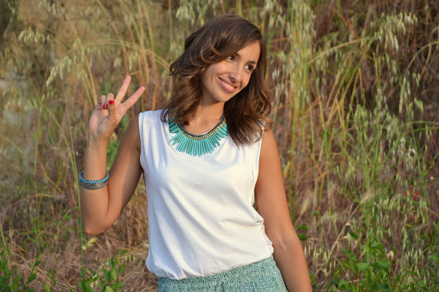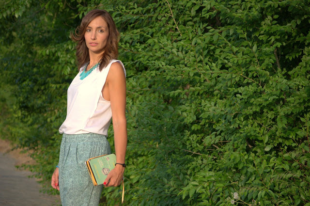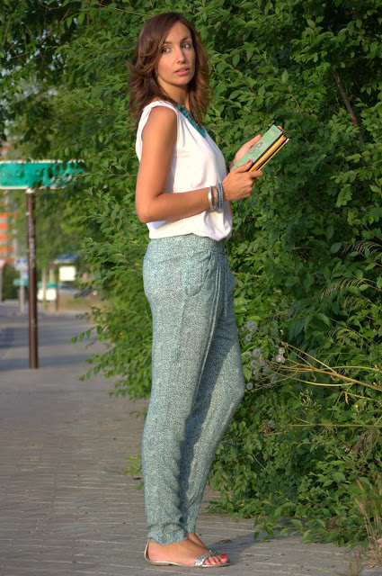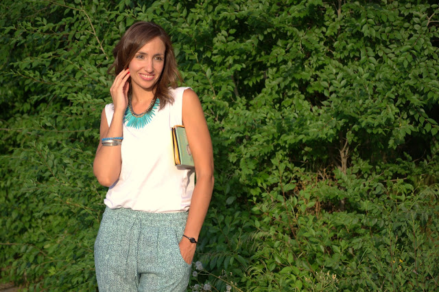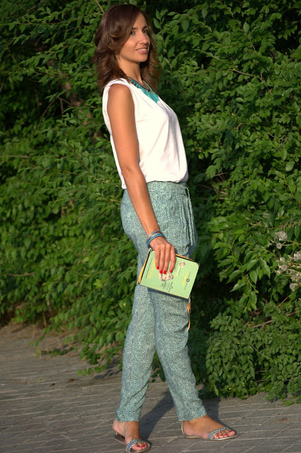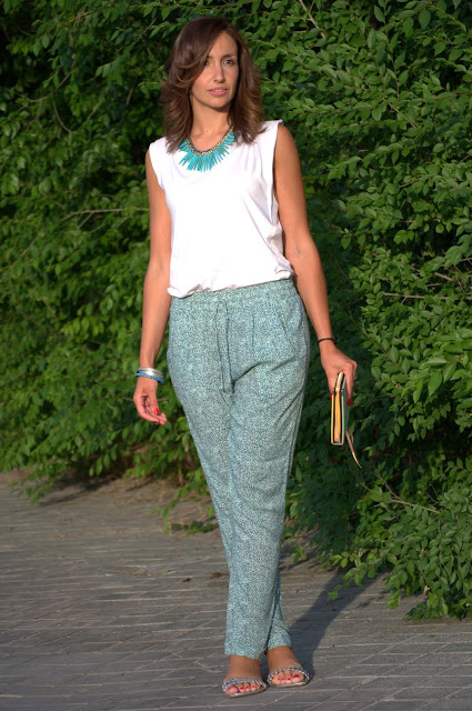 Bueno, os cuento el look que llevo hoy. Desde hace ya algún tiempo se vienen llevando este tipo de pantalones pijameros con cintura elástica, tela fresquita y comodísimos, de los que yo me considero una auténtica adicta, creo que los tengo ya de todos los colores… este es estampado como de topitos en tonos verdes y turquesas como el collar, y la camiseta es una básica que me encanta porque queda bien con todo.