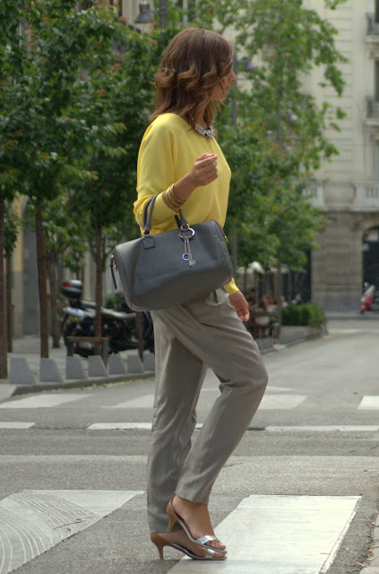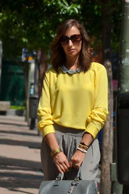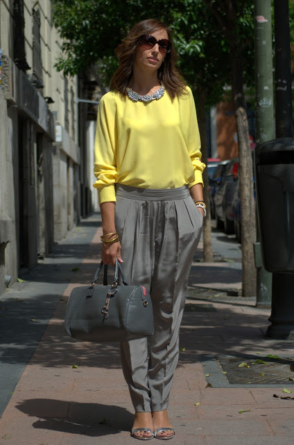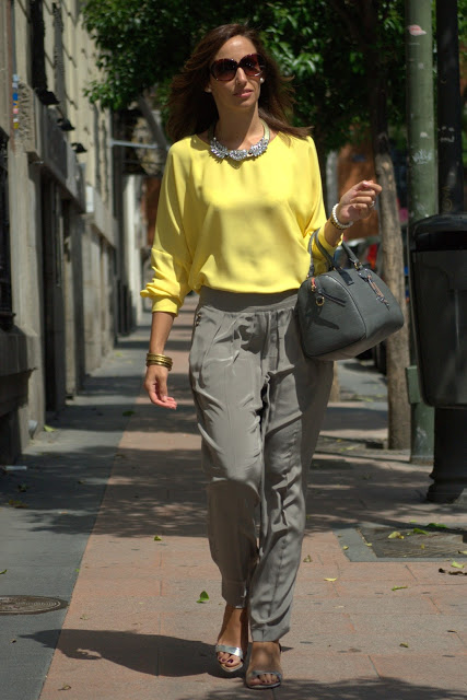 Pues para combinar esta blusa amarilla me he decidido por estos pantalones de seda tipo pijama en color gris… no es tan difícil combinar el amarillo, queda bien con muchos colores, ya os iré enseñando durante este verano.