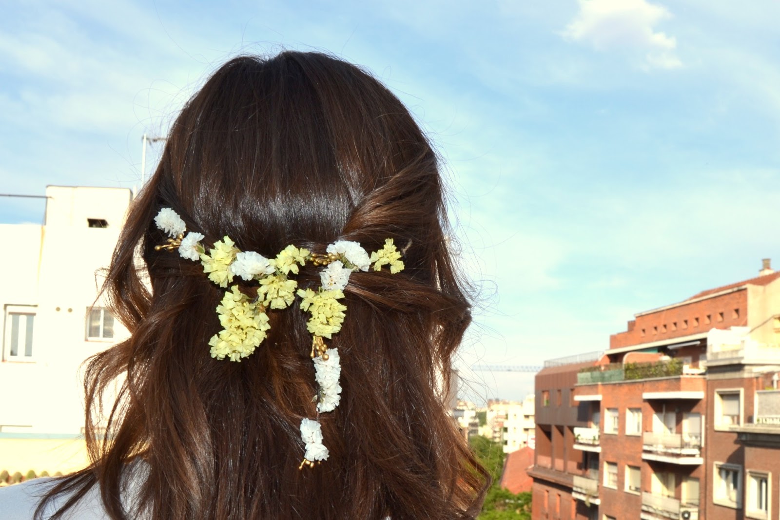 Tocado Ramita de diosa Perséfone – Materiales: flores naturales en blanco y amarillo y pistilos dorados.