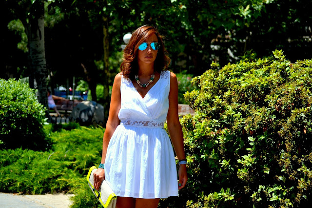 As you know, this season we are seeing a lot of dresses, blouses, shirts with the focus on the back and my new white dress couldn’t be less! I saw it from the new season of Guess and suddenly I fell in love, it is ideal for this time, gentle, comfortable and when you combined it with shoes in blue and green shades, and the bag with fluorine details, I think they give it a different touch.