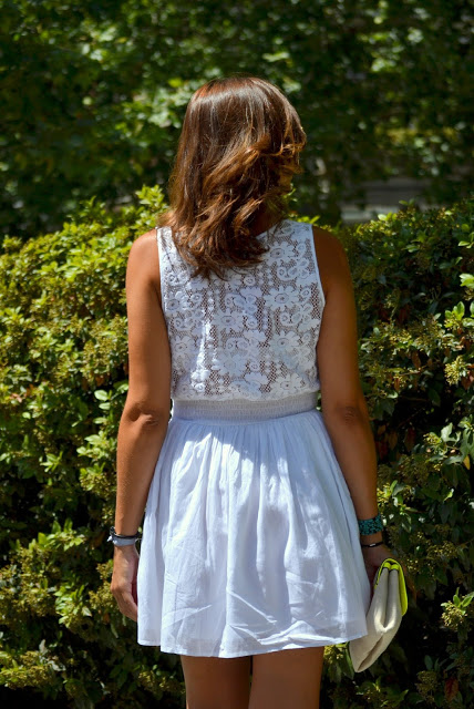 Como ya sabréis, en esta temporada estamos viendo muchos vestidos, blusas, camisetas con la atención centrada en la espalda y mi nuevo vestido blanco no iba a ser menos!! Lo vi entre la nueva temporada de Guess y me enamoré, es ideal para esta época, fresquito, cómodo y al combinarlo con los zapatos en tonos azules y verdes, y el bolso con detalles flúor creo que le dan un toque diferente.