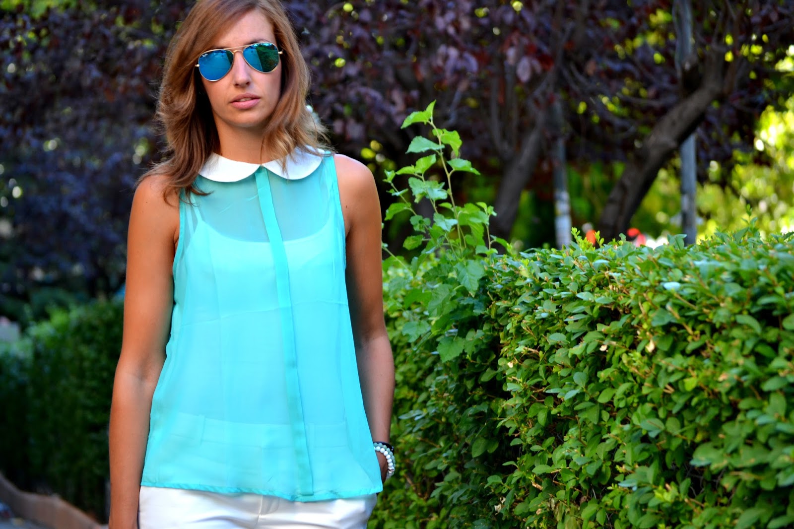 Mi primera elección en esta tienda online ha sido esta blusa con cuellos de bebé, o lo que también conocemos como blusa «Peter pan». Tiene un color ideal, y como los cuellos son blancos, en esta ocasión, me he decidido por combinarla con unos pantalones capri blancos de Zara New Collection, Mis inseparables sandalias de este verano y este bolso con tachas para darle un aire un poco más atrevido.