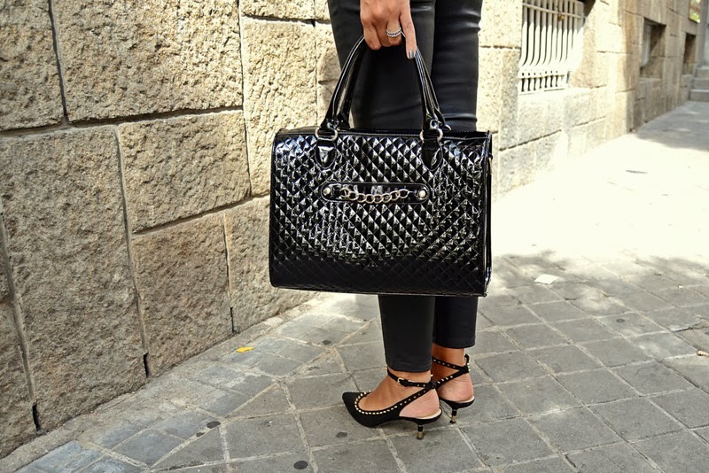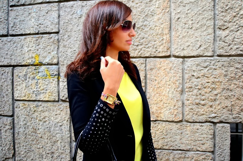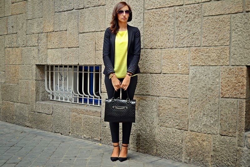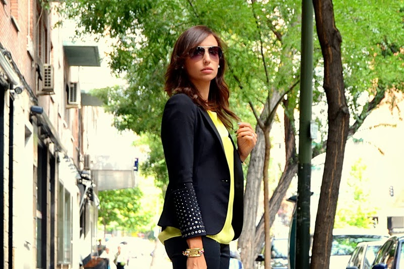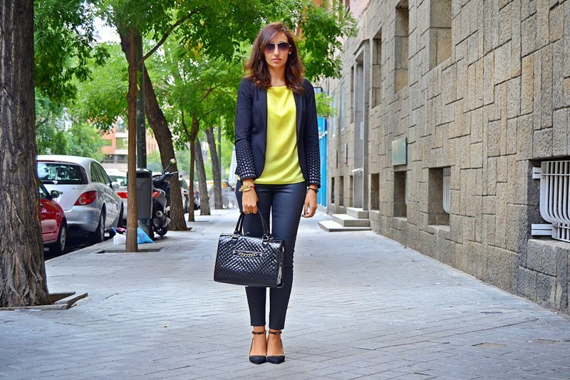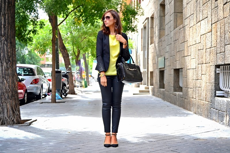 Hola a todos! Ya quedan poquitos días de buen tiempo y por eso, hace unos días, me apeteció ir a tomar un helado a mi heladería favorita, Gelateria Romana. Y con mi outfit, me decidí por algo sencillo y tirando de fondo de armario que de vez en cuando hay que hacerlo. Llevé una americana con tachas en las mangas, del año pasado, que me encanta, es un estilo muy urban-chic, al igual que los zapatos. Debajo llevo una blusa flúor para dar un poco de color, siempre me encantan cuando llevo algo oscuro. Y como toque final mis pantalones nuevos de Mango efecto encerado, no pasa una temporada sin que me compre unos!