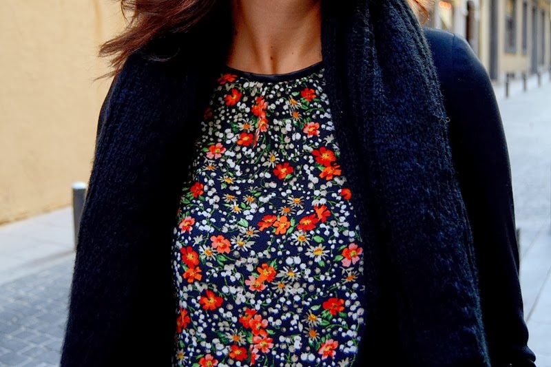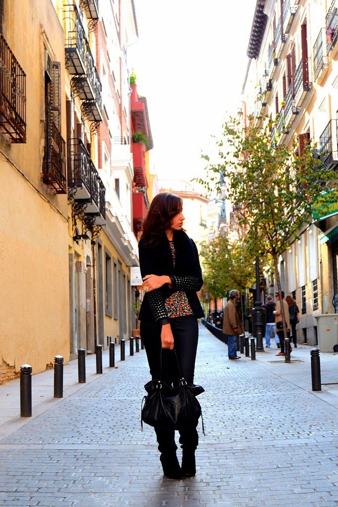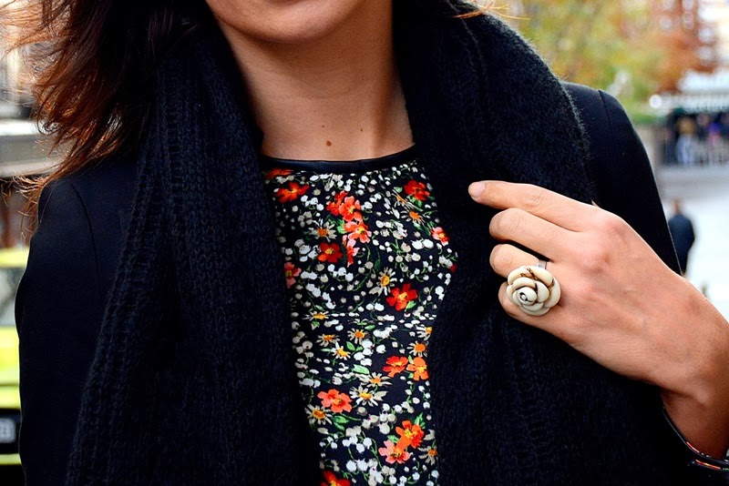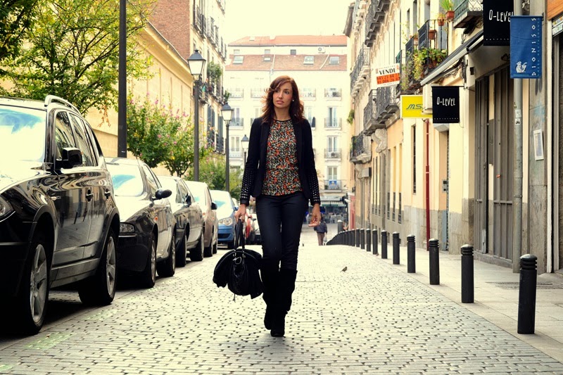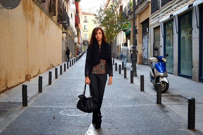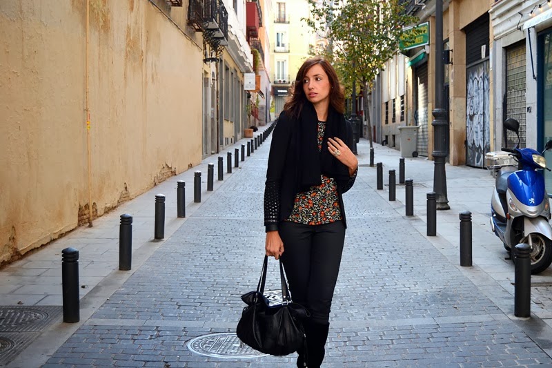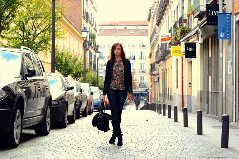 Bueno y el look que llevé a esta pastelería tan entrañable con espíritu francés, no podía ser de otra forma, una blusa de florecitas con ribetes en piel y el resto del look un total black con botas altas de cuña.