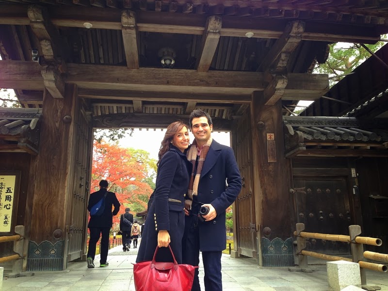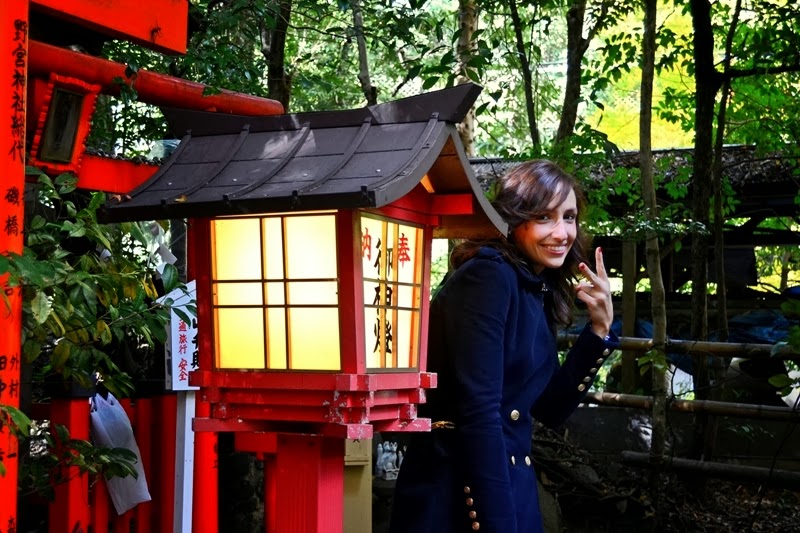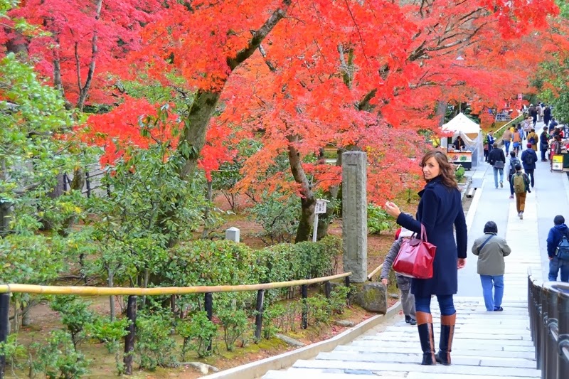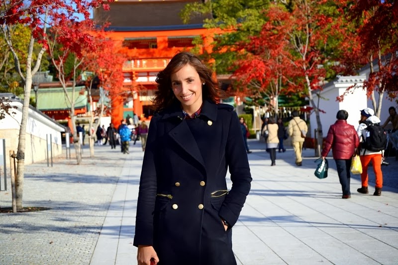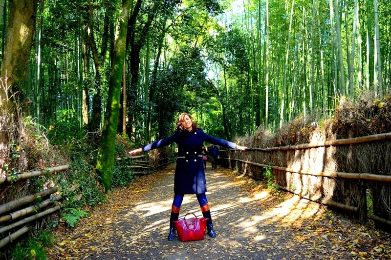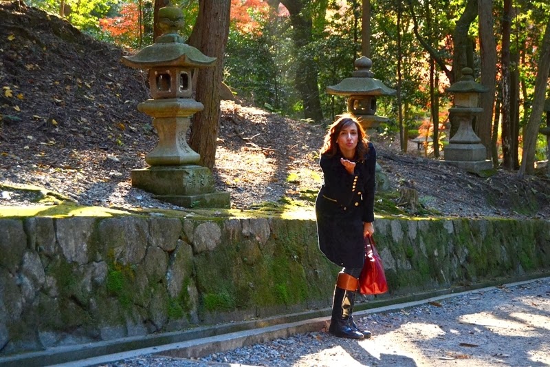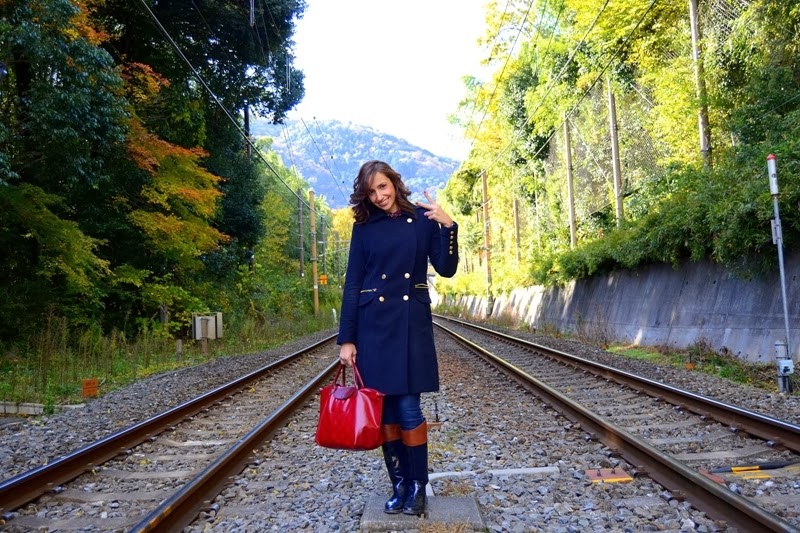 Esta vez he vuelto pronto :D, y aquí tenéis la segunda parte de nuestra visita a Kyoto. Ya que el tiempo iba a estar lluvioso elegí unas botas de charol que van perfectas para la lluvia y quedan fenomenal con vaqueros. En esta ocasión llevo camisa de cuadros y jersey rojo como el bolso, encima abrigo azul de corte militar.
