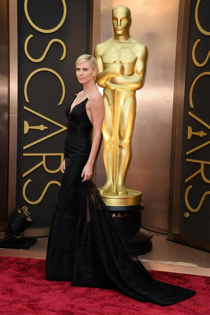 Su collar de Harry Winston de diamantes con un diamante excepcional de talla lágrima está valorado en 15 millones de dólares, quien si no iba a lucirlo, Charlize Theron que para dar todo el protagonismo al collar eligió un Christian Dior en color negro con escote espectacular.