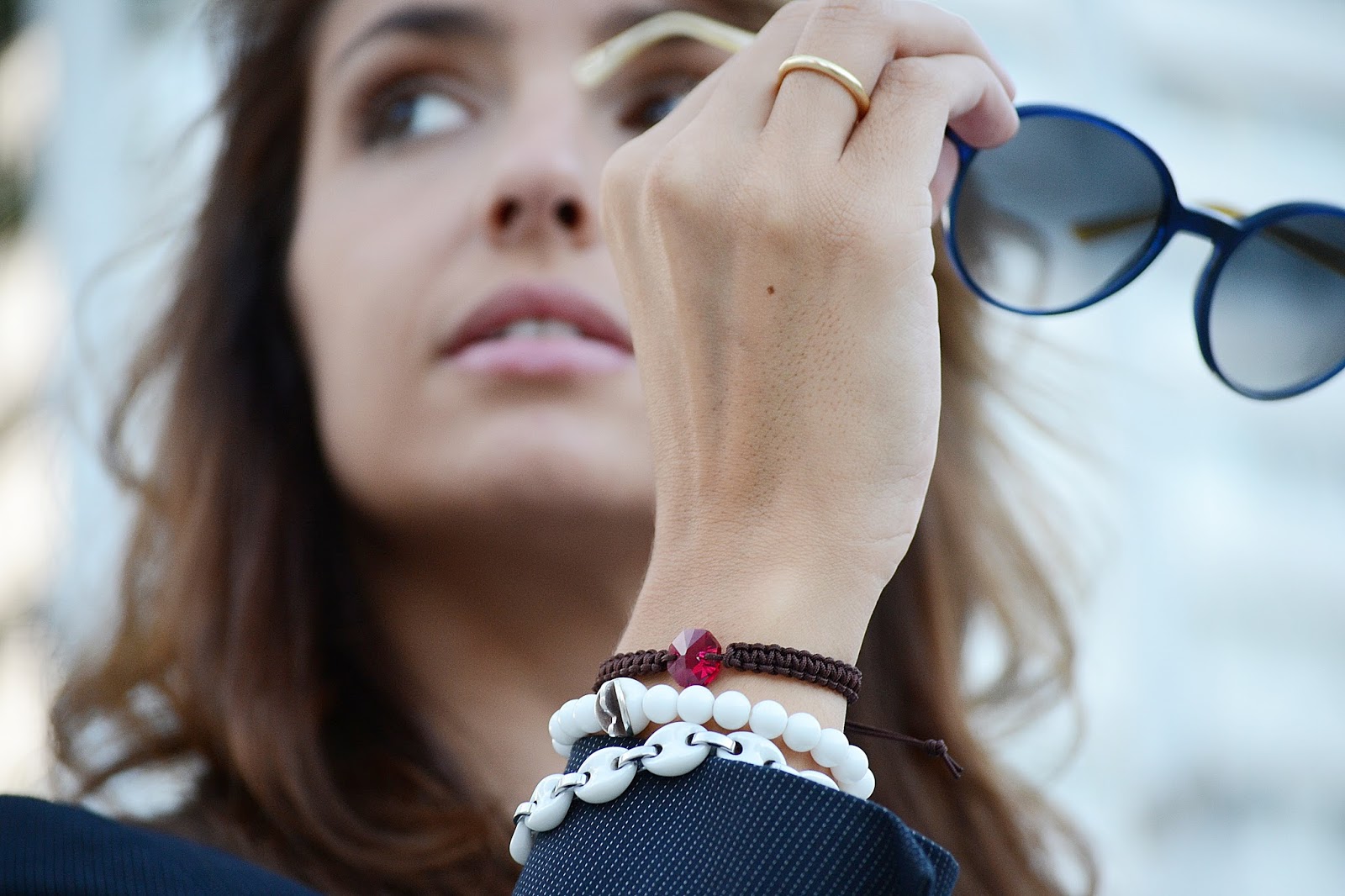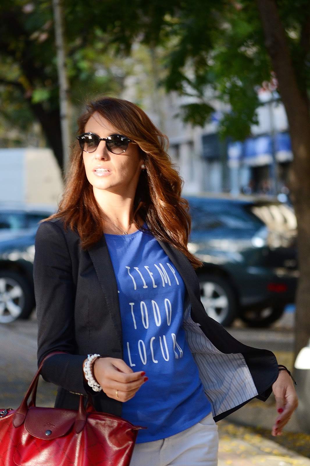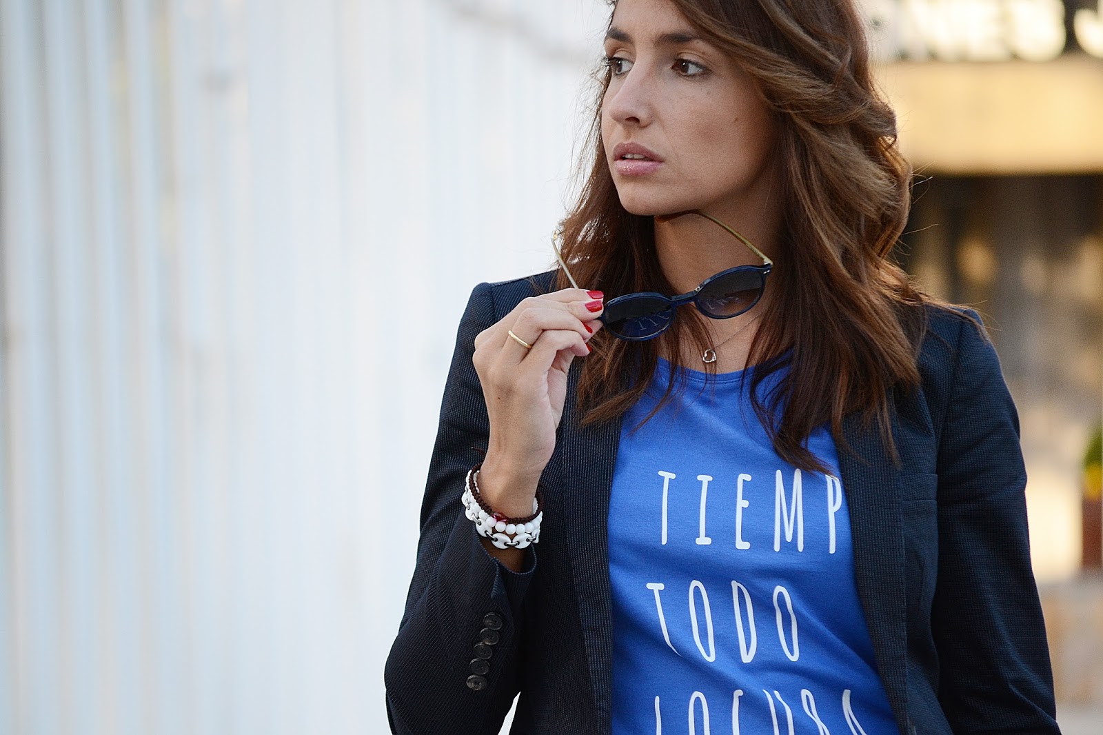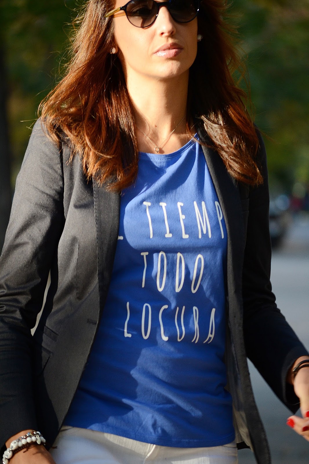 My t-shirt, El Tiempo Todo Locura, from Awesome393«, it’s a word game, this brand has lot of strong messages full of meaning that you will love it! I have combined it with a white jeans, blue blazer and same color stilettos. To break the color mix, a burgundy bag from Lomgchamps and a small red touch in one of my new bracalets from Melwels creaciones. My sunnies, you have already seen in in another post, from Bob Sdrunk, via Optichic. What do you think about this look?