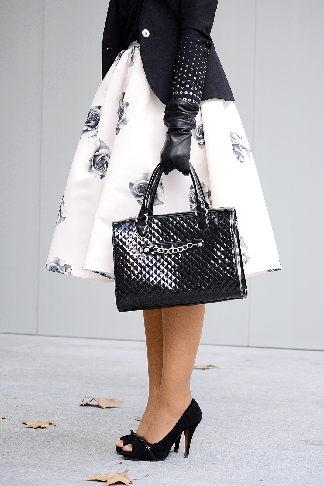 Mi look para la ocasión fue una falda midi estampada, de Choies, super tendencia de este otoño, toda fashionista debe tener una en su armario. Como la falda era suficientemente llamativa opté por combinarla con todo negro de mi fondo de armario, jersey y blazer de Zara, peep toes de Massimo Dutti y bolso de charol de Mango.