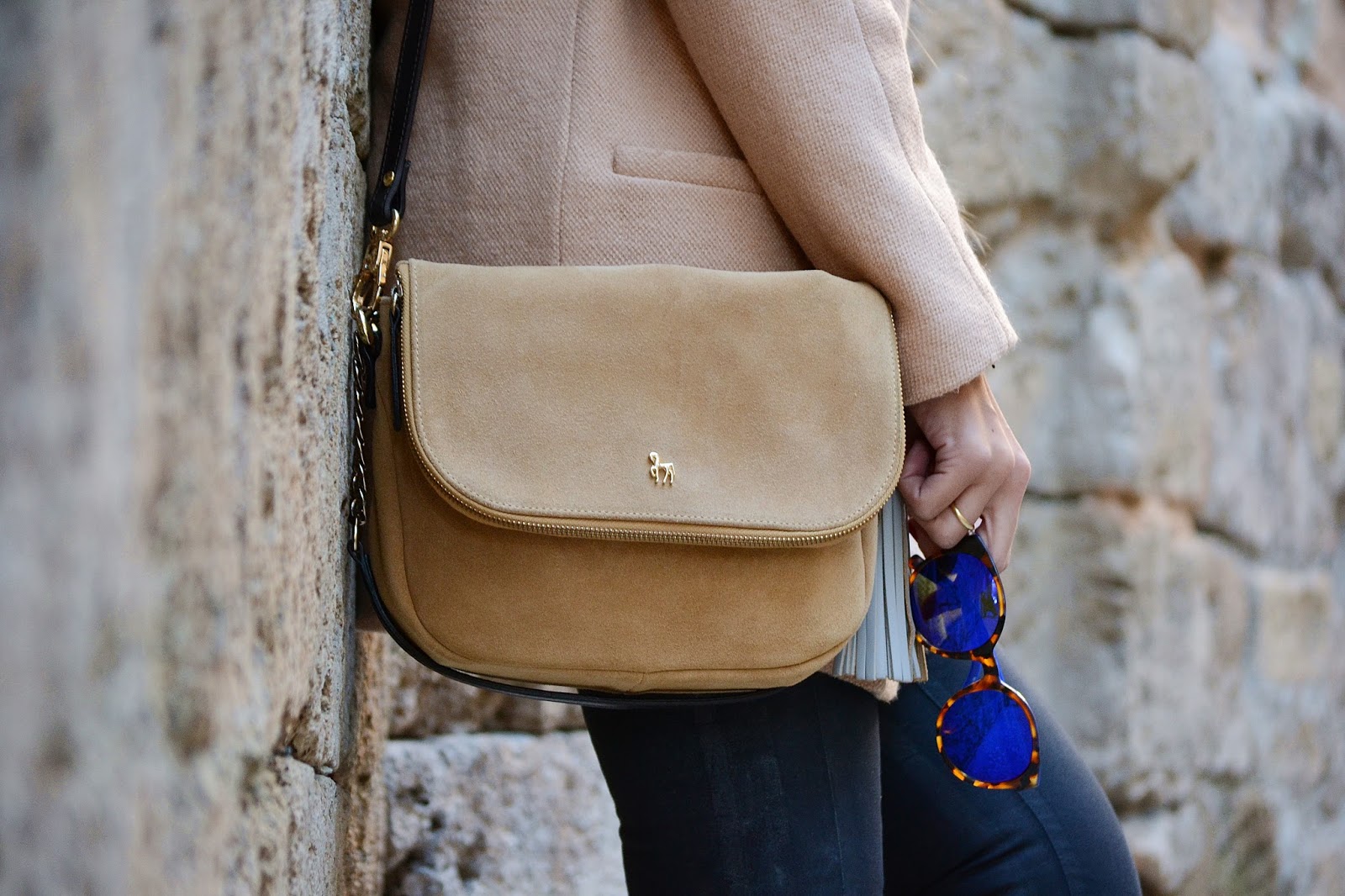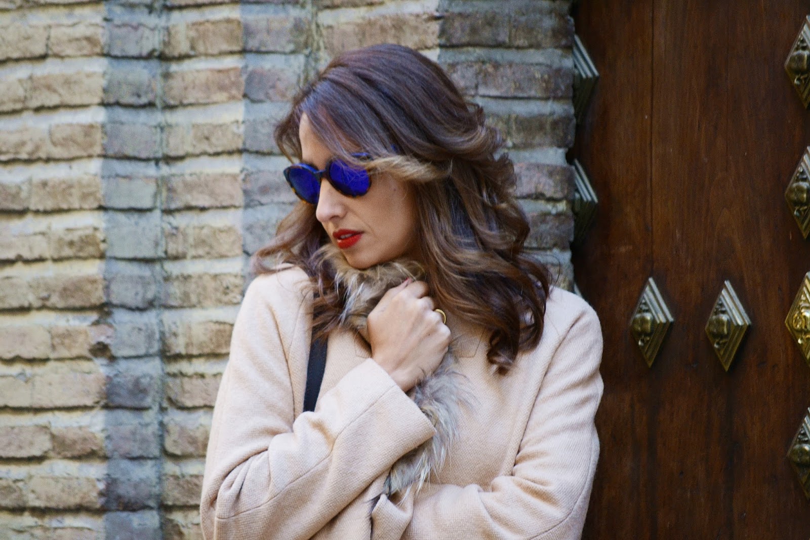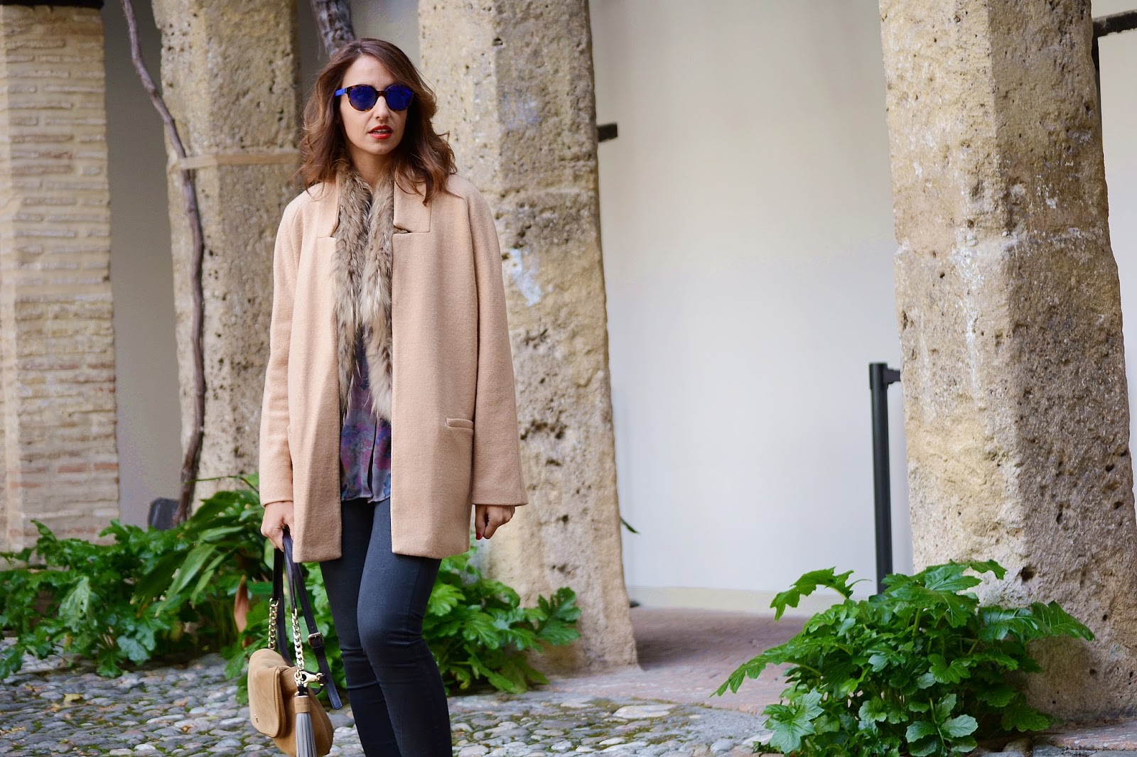 The choosen look for this day was a pair of black pants from Mango, I don’t know how many I can have but in winter they fit with everything! Gray printed blouse and a camel coat all from Mango. In this season of the year, autumn, leaves fall and days are gray, but I think a mix of gray and camel is perfect! As it was a bit chilly, I wore a fur waistcoat from Ambre Babzoe under the coat. This kind of apparel is ideal for cold days, as you can take off the coat but you are still warm with the fur waistcoat. The rest of the look is my camel suede bag from Petusco, booties from Zara and the wonderful mirrored sunies from Étnia Barcelona via Optichic.
