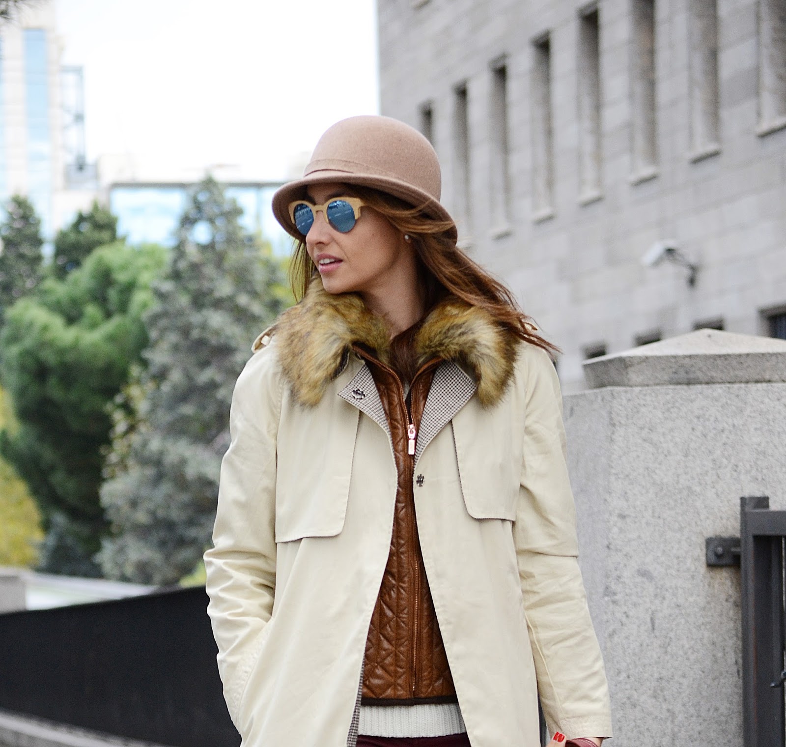 El resto del outfit, jersey y pantalón de Mango, New Balance, sombrero de Zara, bolso de Casabras, pequeñito pero cabe de todo! Y las gafas de sol Woodys Barcelona, Optichic, de madera y lentes de espejo en color azul, de estilo vintage muy trendy. Que os parece este look? Te pondrías tu trench con un chaleco?