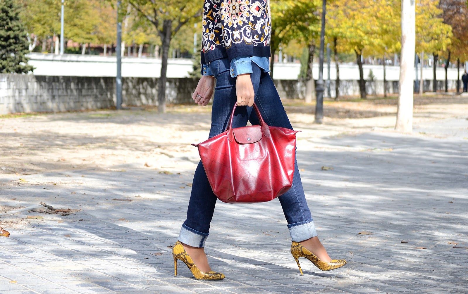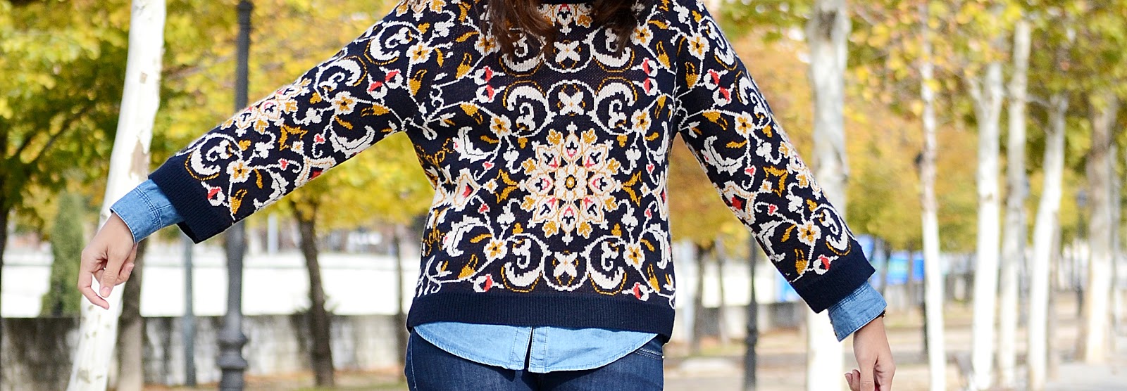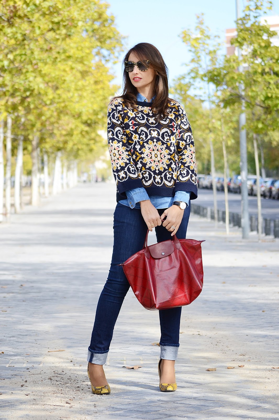 Esta temporada es tendencia el jersey, el punto, los sweaters de toda la vida en todas sus versiones, lisos, con ochos o con estampados de lo más originales. Este es uno de mis favoritos para este otoño, es de Dandara, una firma con estampados exóticos, colores orientales pero siempre muy natural. Lo he combinado con fondos de armario, unos jeans de Guess, camisa denim de Springfield, y con lo complementos he querido hacer un guiño a los colores del jersey, bolso rojo de Longchamp y zapatos mostaza de Zara. Como no para completar mi look, una gafas de sol de Dolce & Gabbana, de Optichic, de estampado exótico y mi reloj de Daniel Wellington, que como ya os conté en otro post, durante el mes de noviembre podéis usar el código «elblogdesilvia» para obtener un descuento del 15% en todos los productos de Daniel Wellington, en danielwellington.com