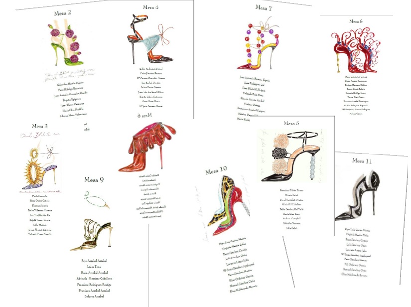 Como ya sabéis adoro los diseños de Manolo Blahnik, tengo varios libros de sus bocetos, y los zapatos que yo llevaba eran unos Manolos. Pues no se me ocurrió mejor idea que utilizar sus bocetos para la imagen del seating, meseros, menús y tarjetas de los regalitos de las invitadas.