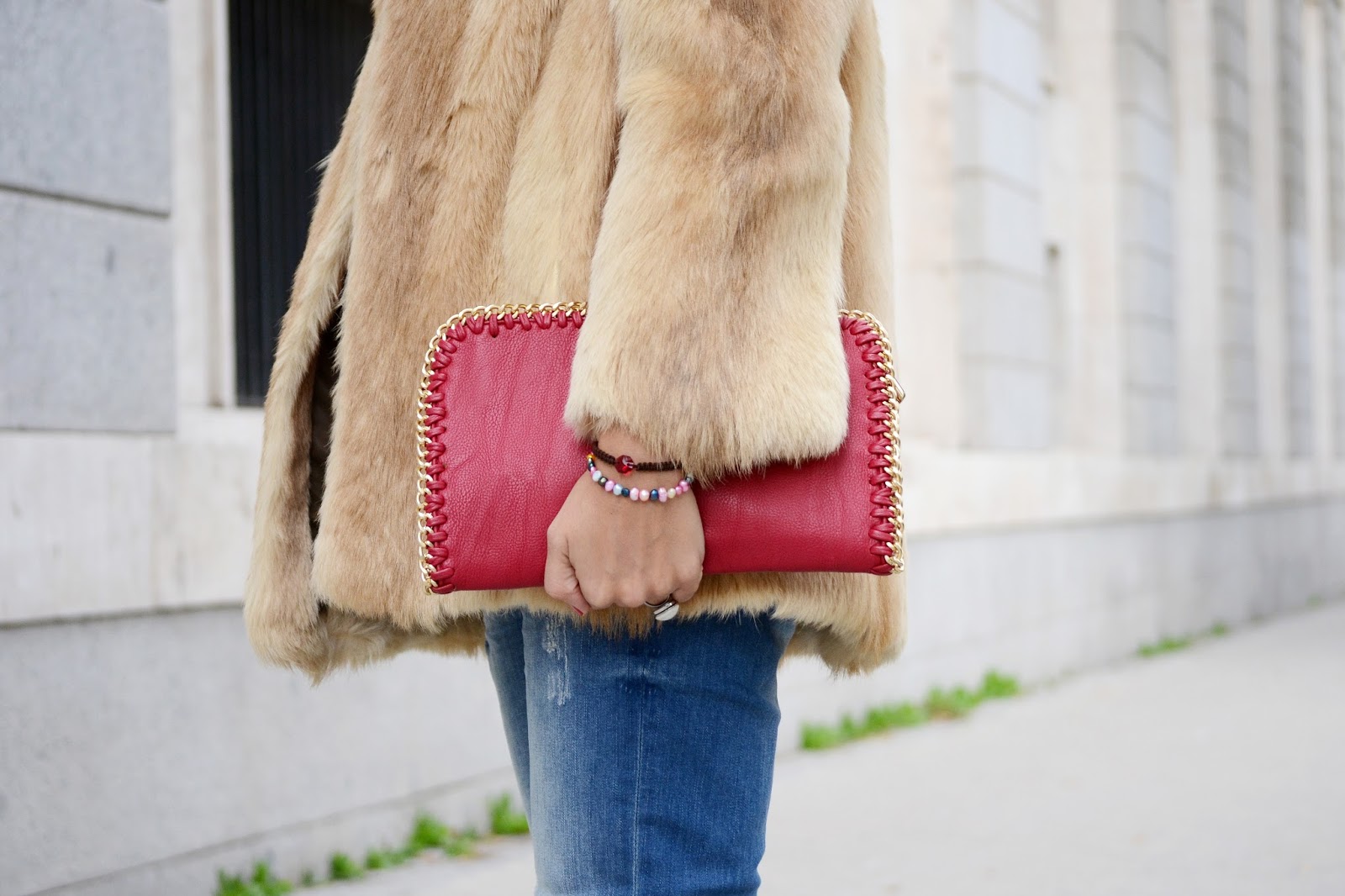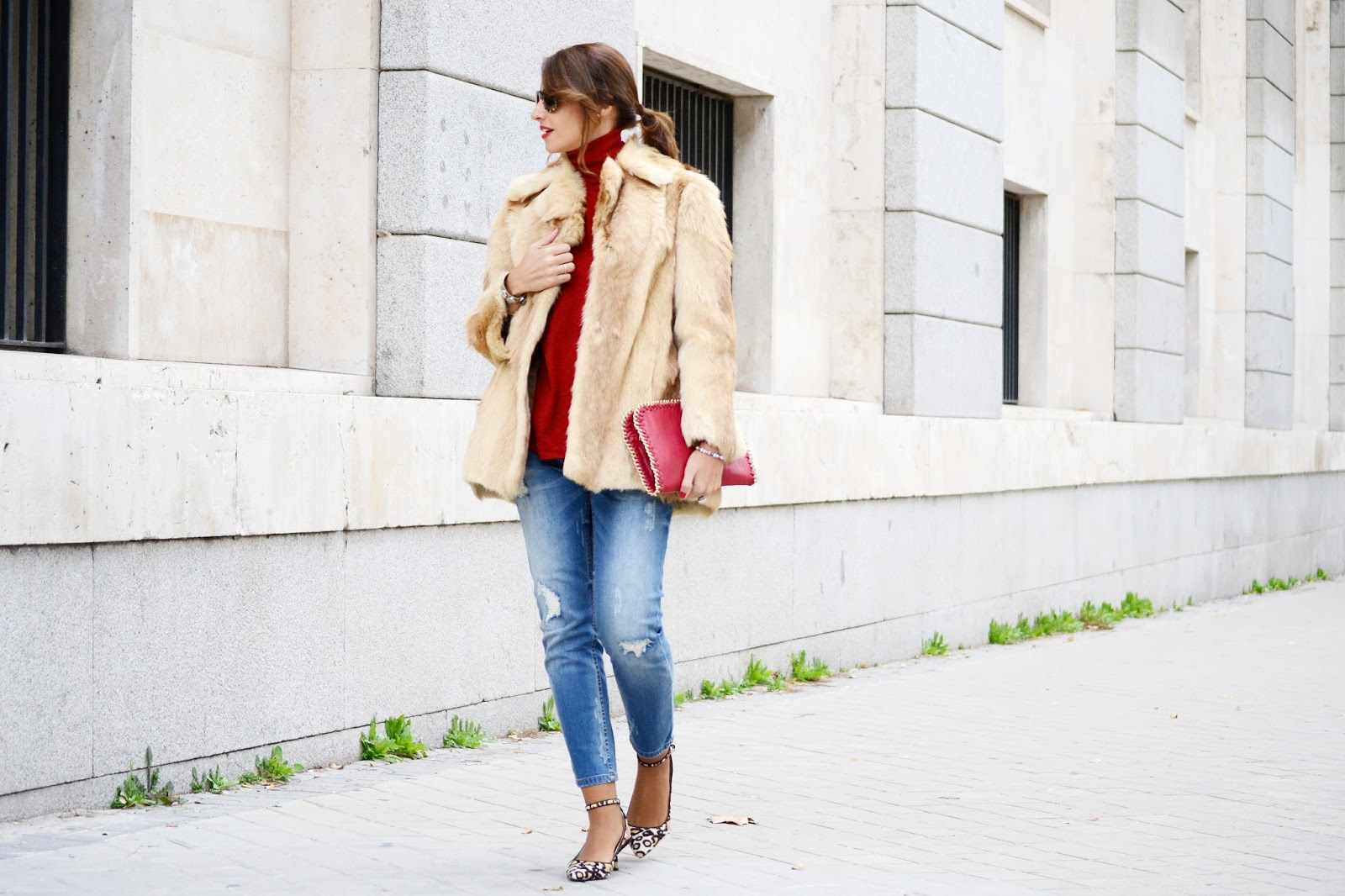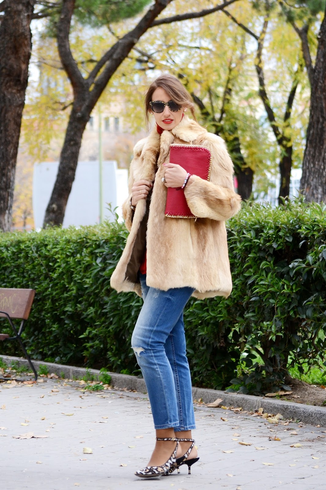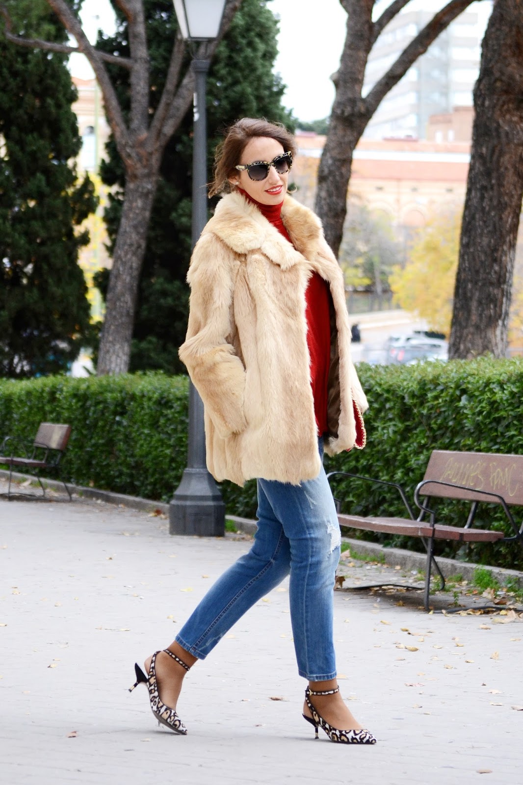 Llevo un abrigo de pelo vintage, lo he rescatado del armario de mi madre, y es que me parecía tan fantástico que no lo podía dejar allí. En esta ocasión lo que combinado con prendas muy básicas para dar todo el protagonismo al abrigo. Lo llevo con jeans boyfriends de Mango, jersey y bolso rojo y zapatos de leopardo de Zara. Los complementos, pulsera de Melwels Creaciones, anillo de Kuir me up y mis gafas de sol de Dolce & Gabbana, de Optichic.