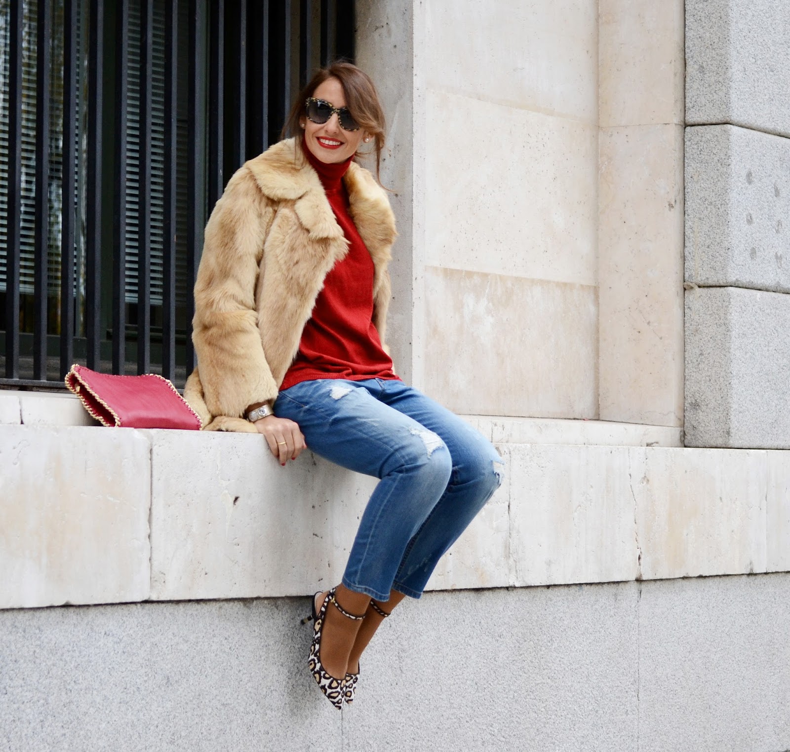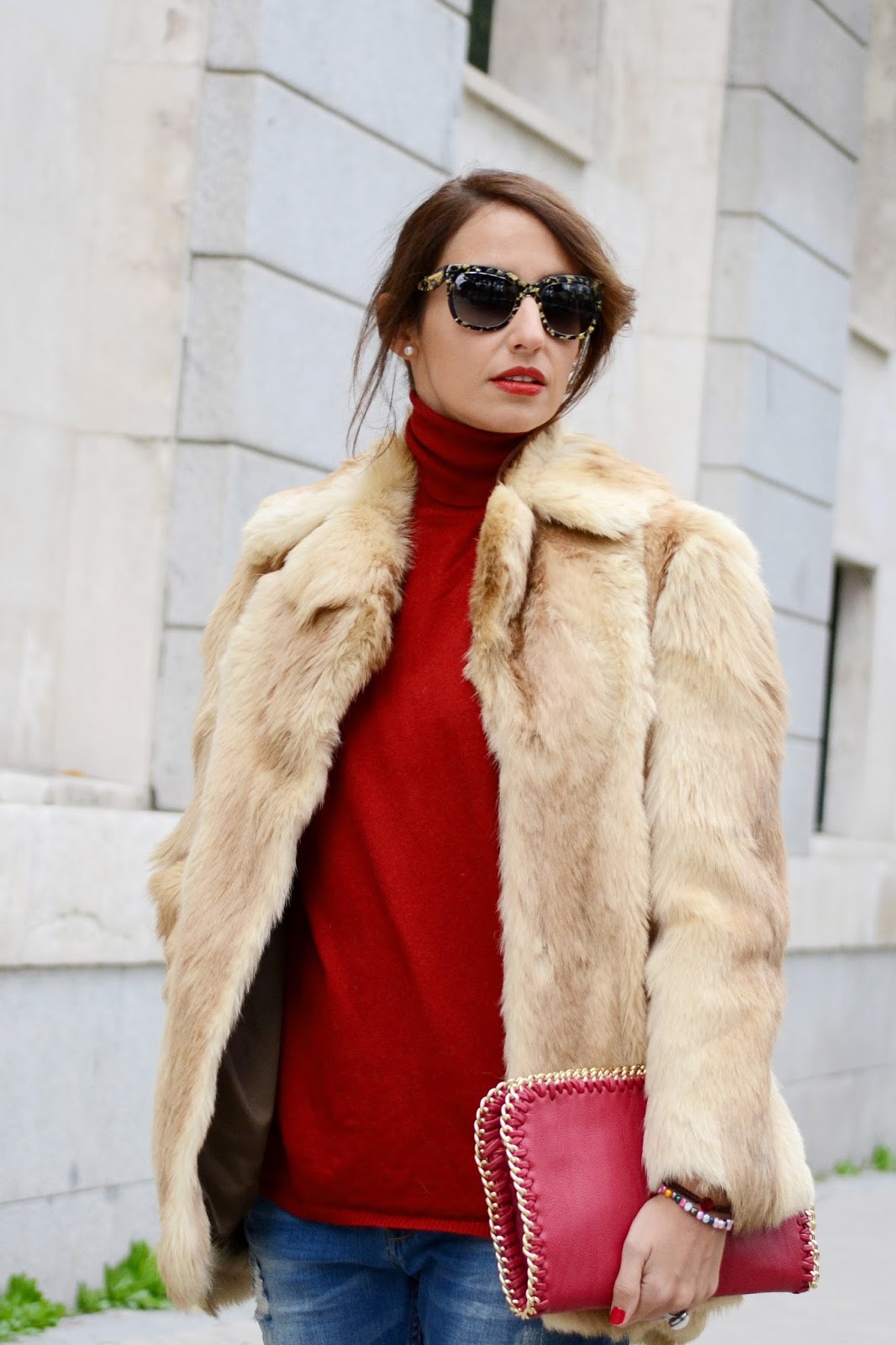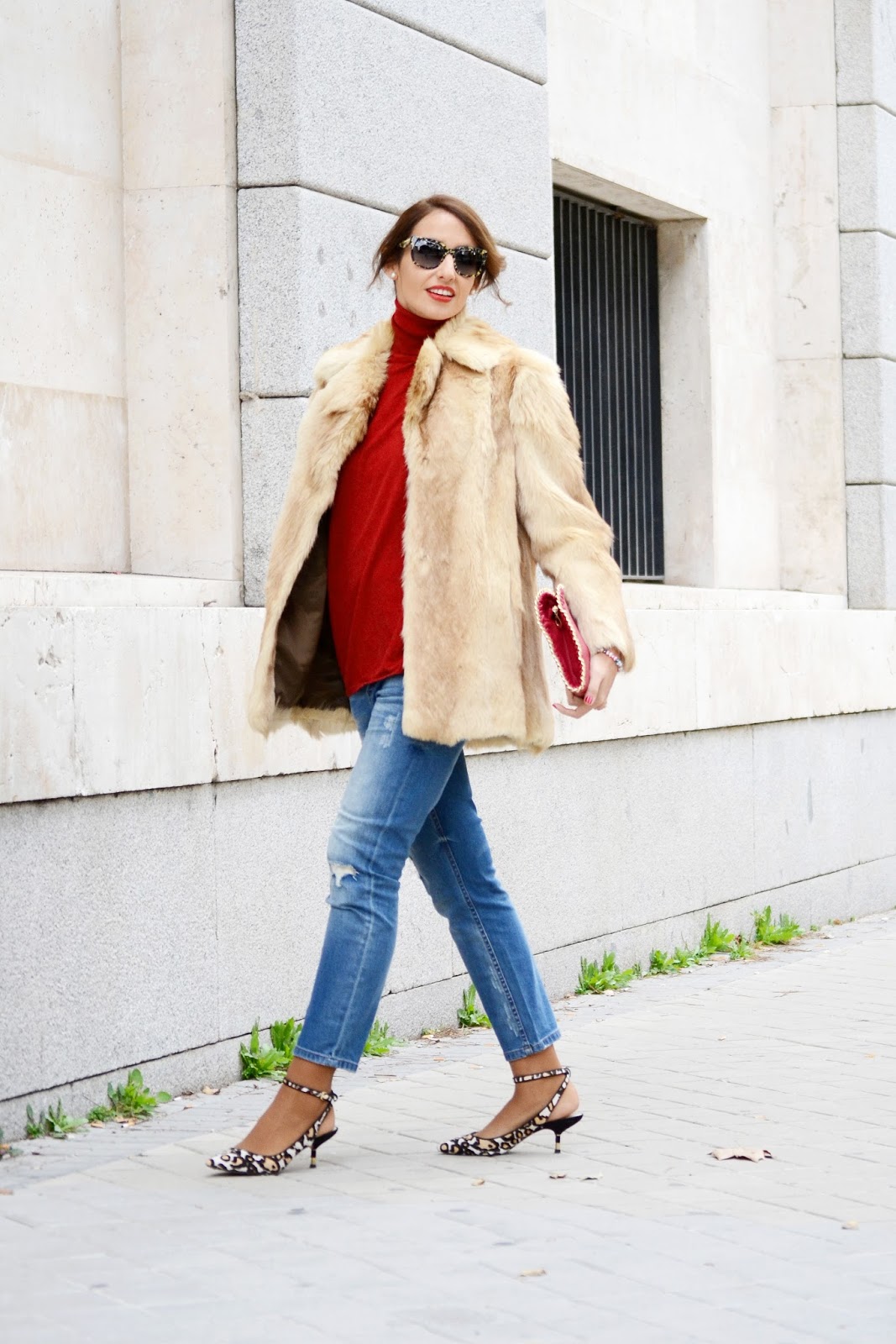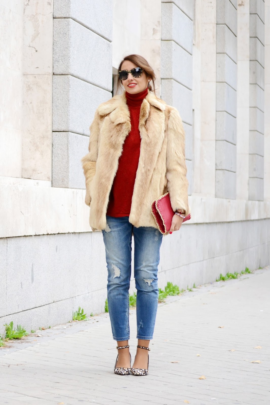 Llevo un abrigo de pelo vintage, lo he rescatado del armario de mi madre, y es que me parecía tan fantástico que no lo podía dejar allí. En esta ocasión lo que combinado con prendas muy básicas para dar todo el protagonismo al abrigo. Lo llevo con jeans boyfriends de Mango, jersey y bolso rojo y zapatos de leopardo de Zara. Los complementos, pulsera de Melwels Creaciones, anillo de Kuir me up y mis gafas de sol de Dolce & Gabbana, de Optichic.