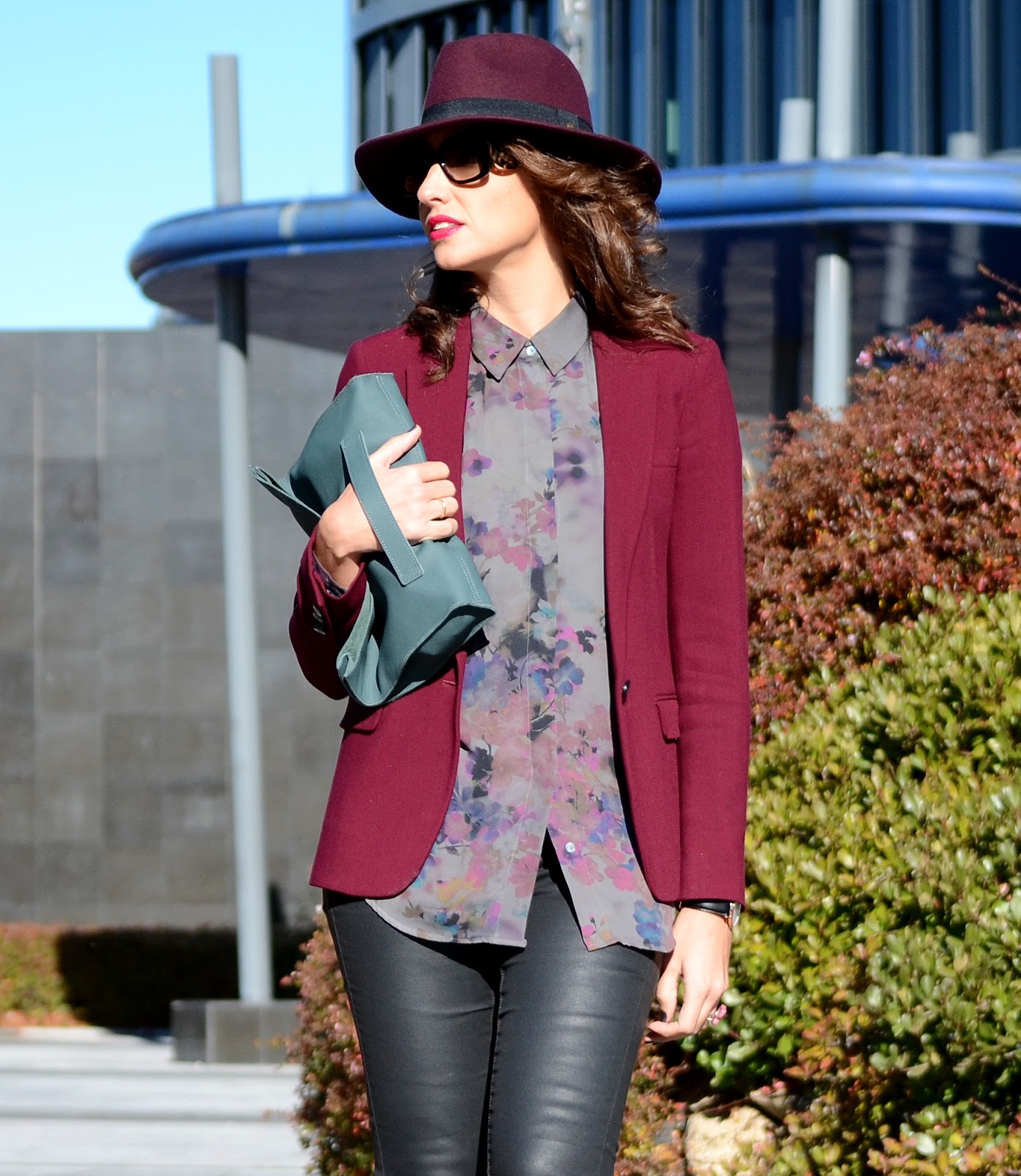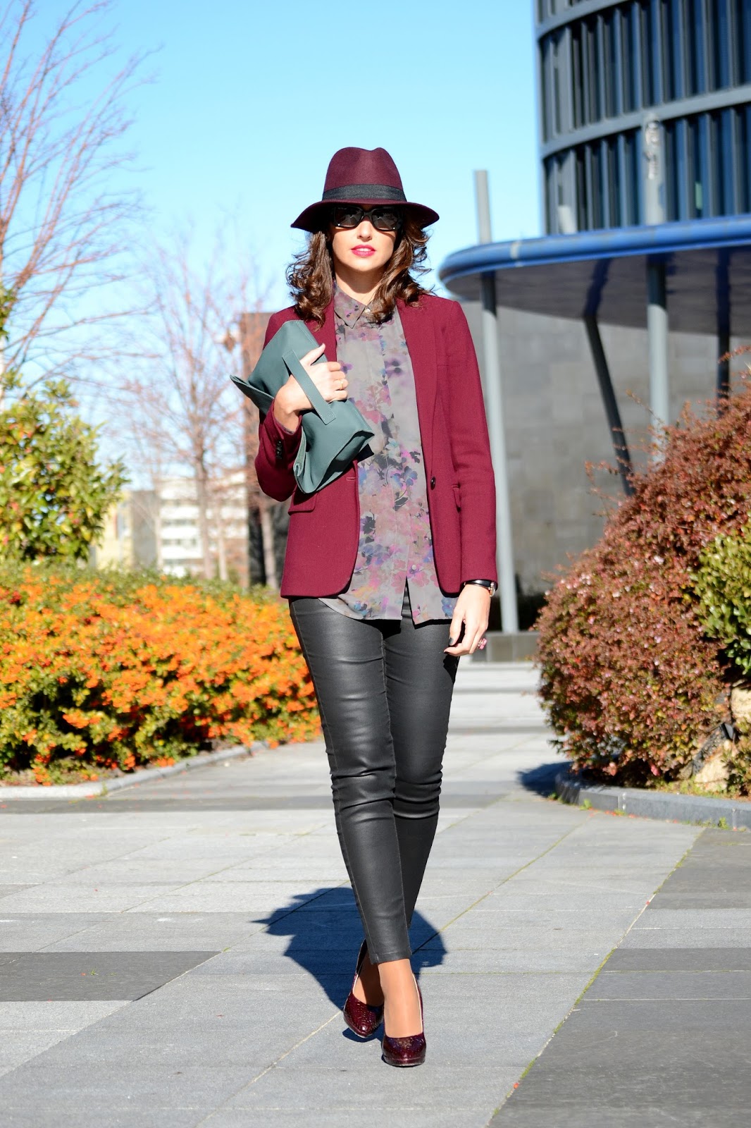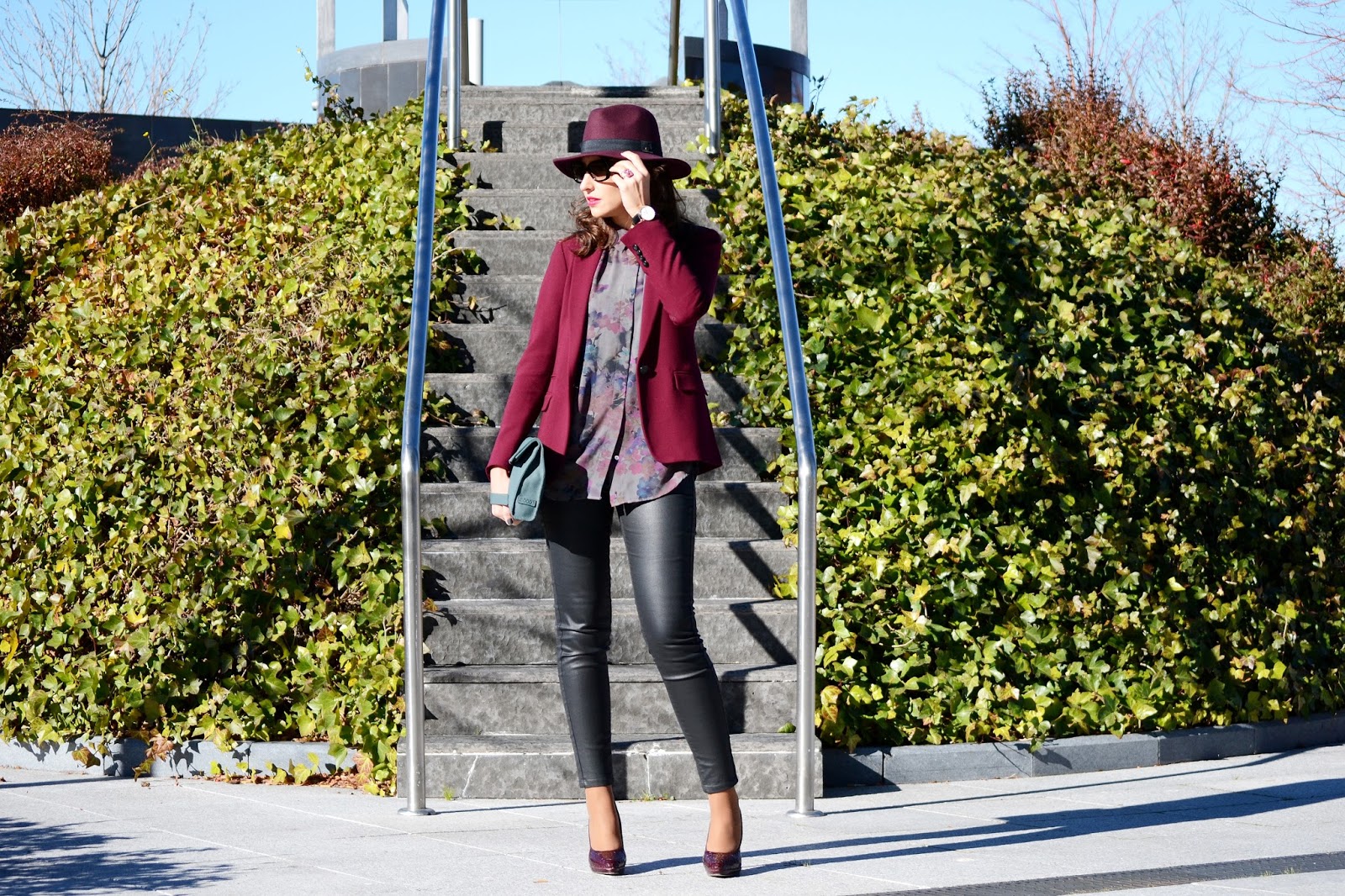 Llevo un blazer de Massimo Dutti, sombrero de Day & day y zapatos de Menbur, todo en el color de la temporada, burgundy. El resto del look, una blusa estampada y pantalón negro de Mango, bolso de Ecco y unas fantásticas gafas de sol de Prada, Optichic, son adorables con esas patillas! Me las veréis en muchas más ocasiones. Y los complementos perfectos, reloj de Daniel Wellington y anillo de Tous.