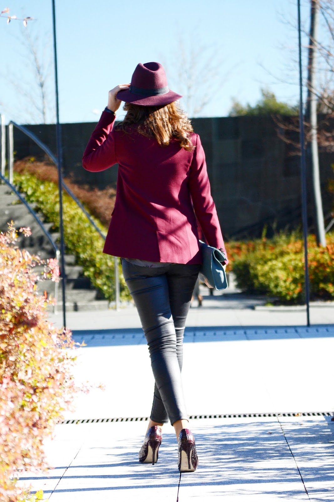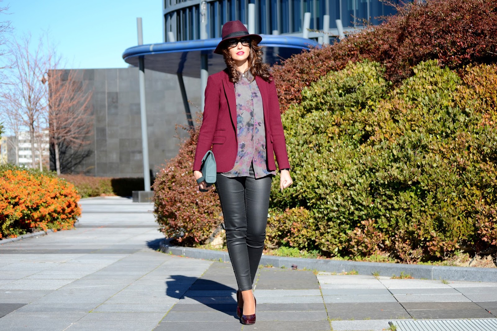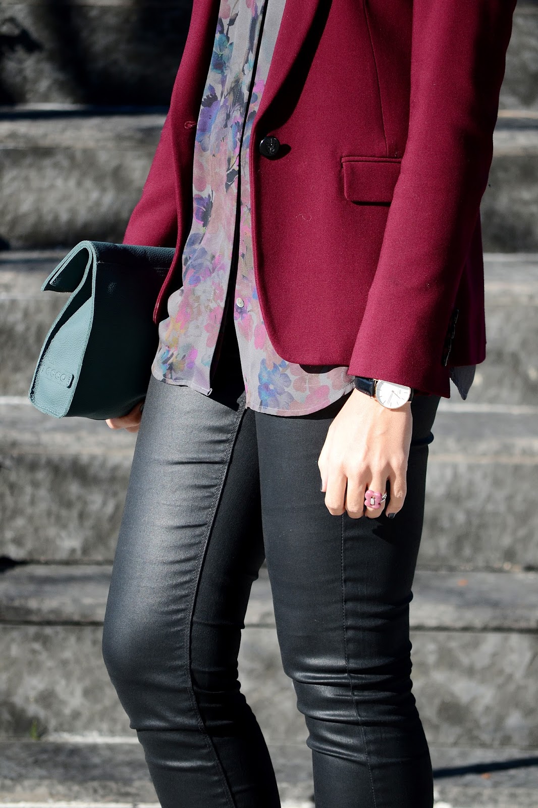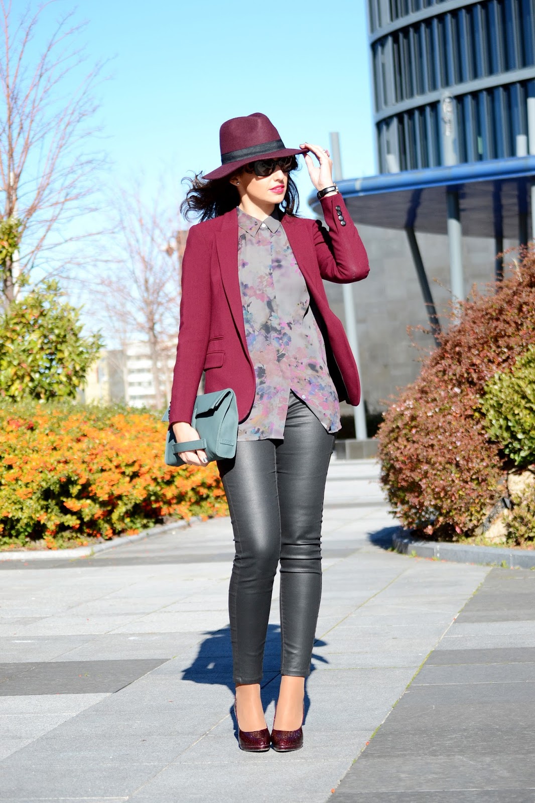 Llevo un blazer de Massimo Dutti, sombrero de Day & day y zapatos de Menbur, todo en el color de la temporada, burgundy. El resto del look, una blusa estampada y pantalón negro de Mango, bolso de Ecco y unas fantásticas gafas de sol de Prada, Optichic, son adorables con esas patillas! Me las veréis en muchas más ocasiones. Y los complementos perfectos, reloj de Daniel Wellington y anillo de Tous.