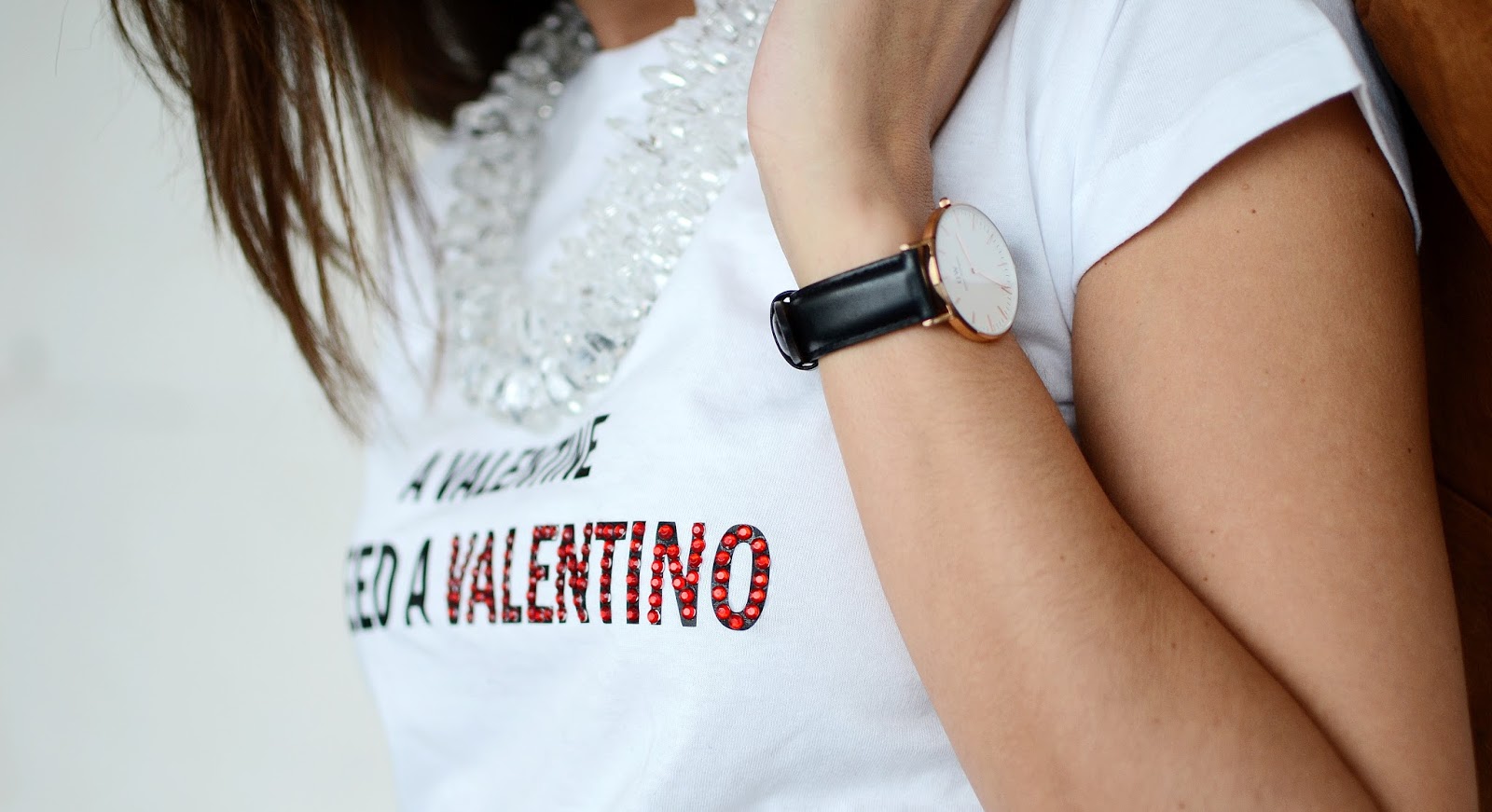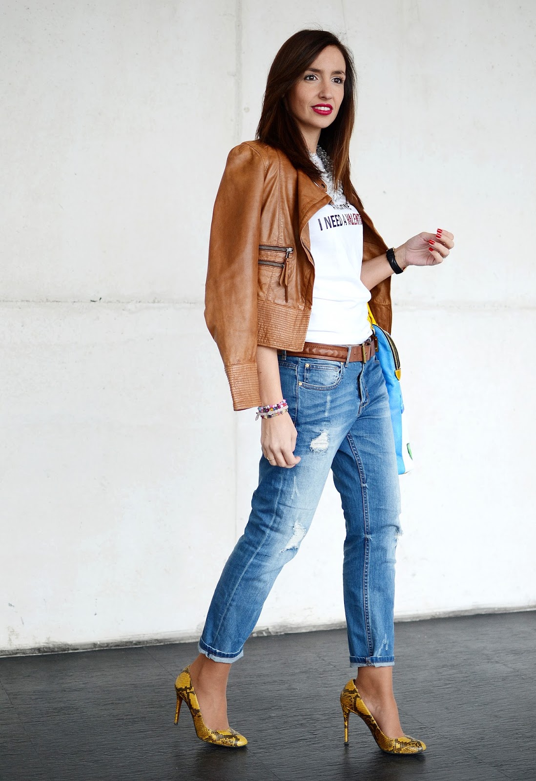El look que elegí para esta 5º jornada de la MBFW de Madrid fue algo diferente al resto de mis looks de «fashion week». En esta ocasión, y con motivo del próximo día de San Valentín, llevé una camiseta con un mensaje muy divertido, de Like a Princess. La he combinado con unos jeans tipo boyfriends, unos stilettos de serpiente, una biker de Mango y un bolso con un dibujo muy especial, de Maxim Lumier.