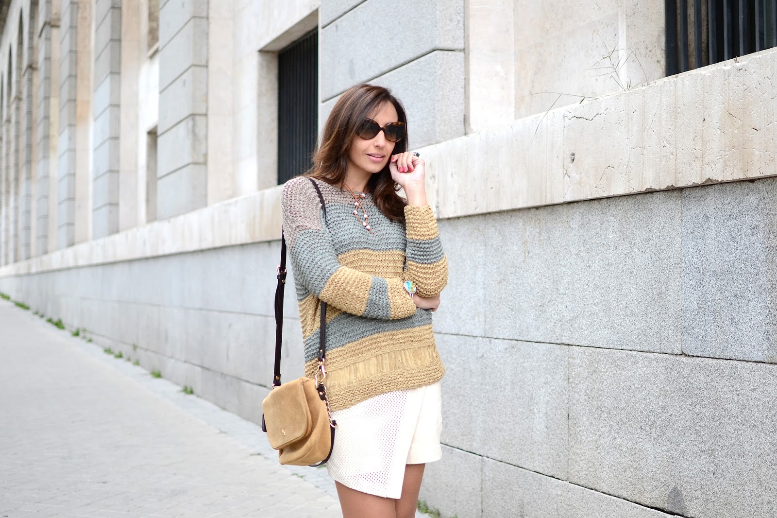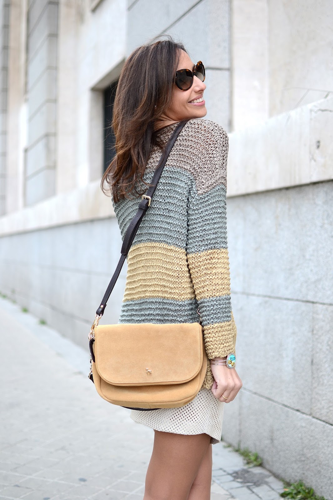 En algún post ya he comentado que para mí una de las tendencias top de esta primavera es el ante. Lo vamos a ver en todo, pantalones, faldas, chalecos… En este caso yo he elegido una monísima mini falda en ante beige de Supertrash de corte asimétrico y semi troquelada. La he combinado con un maxi jersey de punto de Zara en la misma gama cromática, que le da un contrapunto y crea un outfit «maxi-mini». Los complementos, perfectos para este look, son mis botines de Carolina Herrera, un bolso de Petusco también en ante en los mismos tonos, collar de Bisutería la Ola, y unas gafas de Marc Jacobs que podéis encontrar en Optichic.