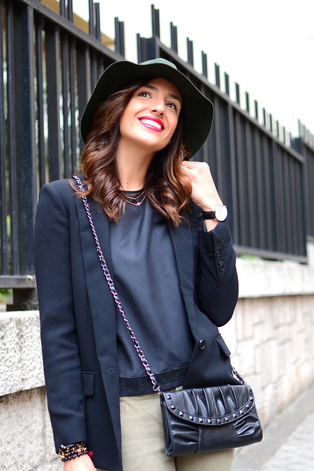 Pues mi look de hoy es en tono verde militar y negro. Llevo una blusa negra muy original de Les Petites, que, como ya sabéis, es una de mis marcas favoritas. Pantalón, de Zara, y sombrero verde, de Mango, blazer negra y mis manolitos negros. Que os parece este look?