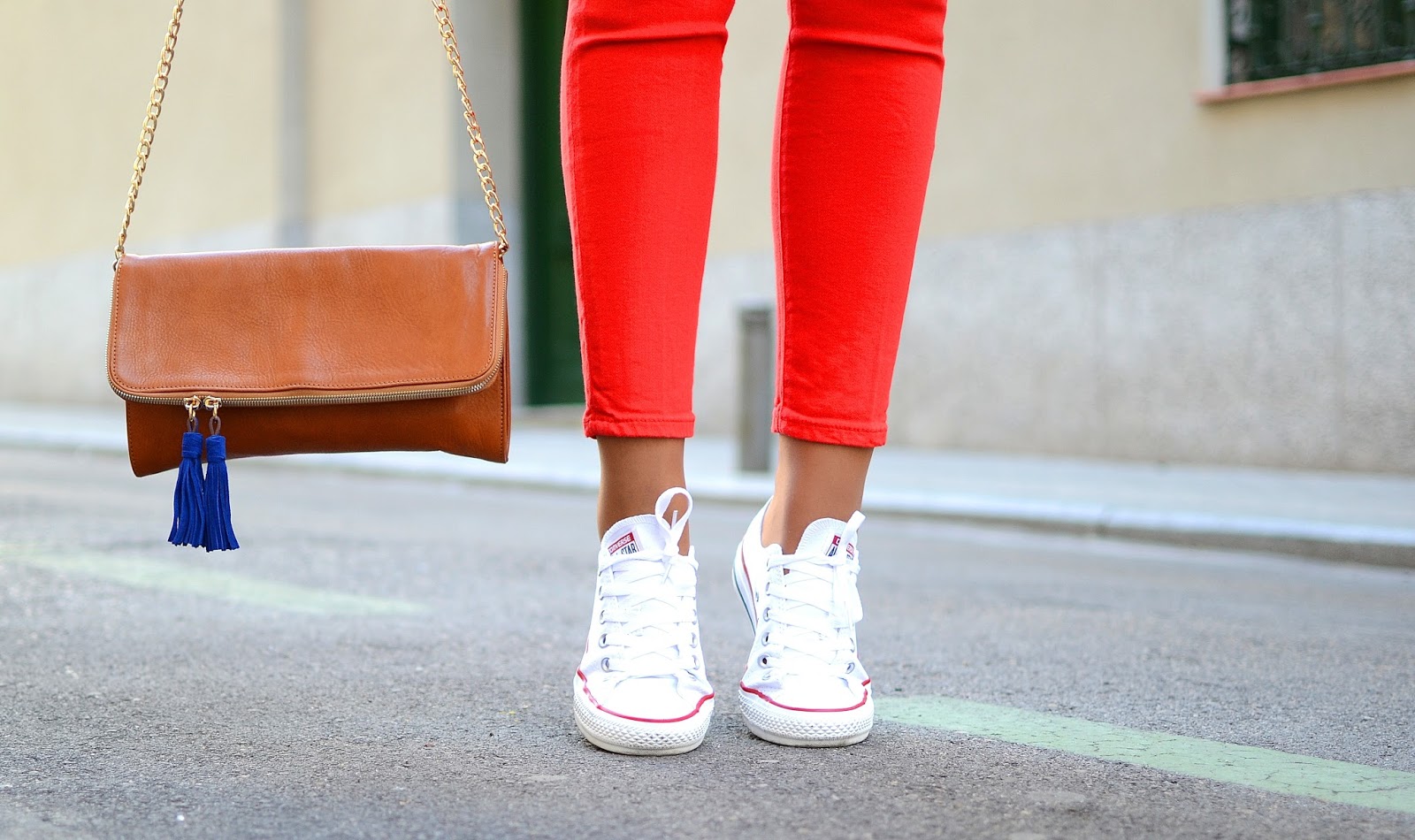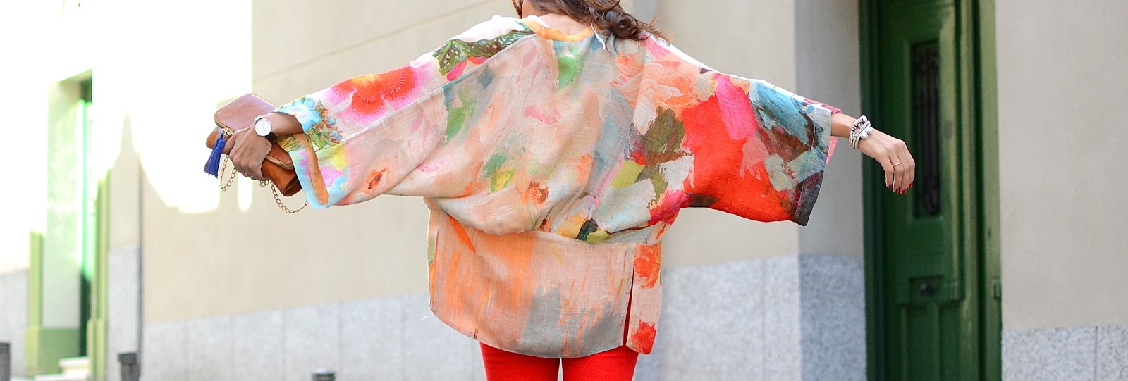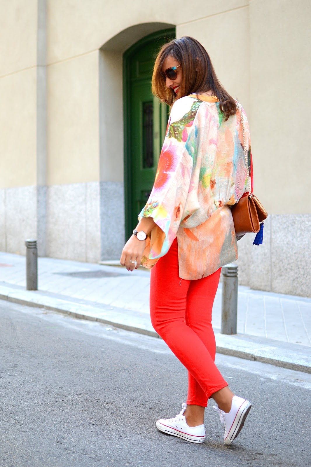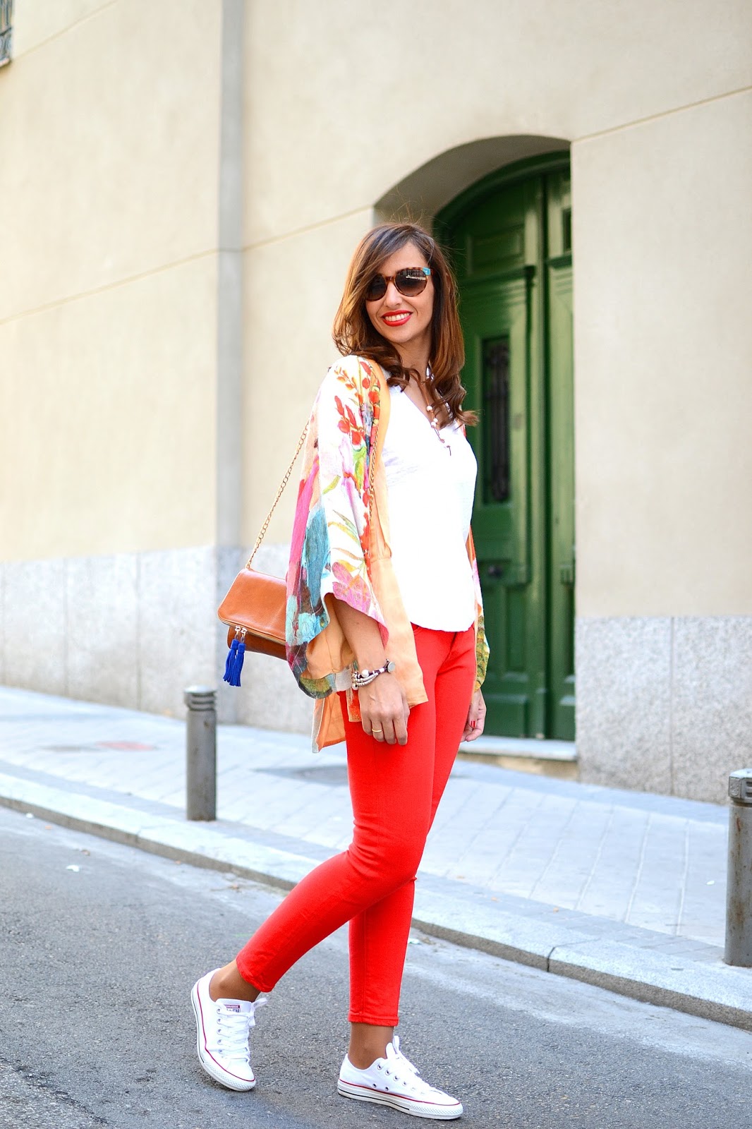 Pues parece que por fín el buen tiempo ha vuelto y dejamos atrás los días grises del invierno. El color se abre camino, las flores se dejan ver y nuestra forma de vestir se adapta a esta nueva dinámica. Hoy me he inspirado en esto, en las flores, los colores, y he elegido un look super primaveral lleno de colores fuertes y cálidos. Llevo un kimono de Blank (he descubierto esta firma hace poco y debo decir que me gustan mucho las cositas que tienen) de un tejido muy ligero y vaporoso, que he combinado con unos pantalones rojos de Zara, y una camiseta blanca de la misma textura del kimono también de Zara. Los complementos son mi collar de Bisutería La Ola, bolso de Les Petites y mis converse blancas. Las gafas de sol son unas Michael Kors que he elegido en Optichic.
