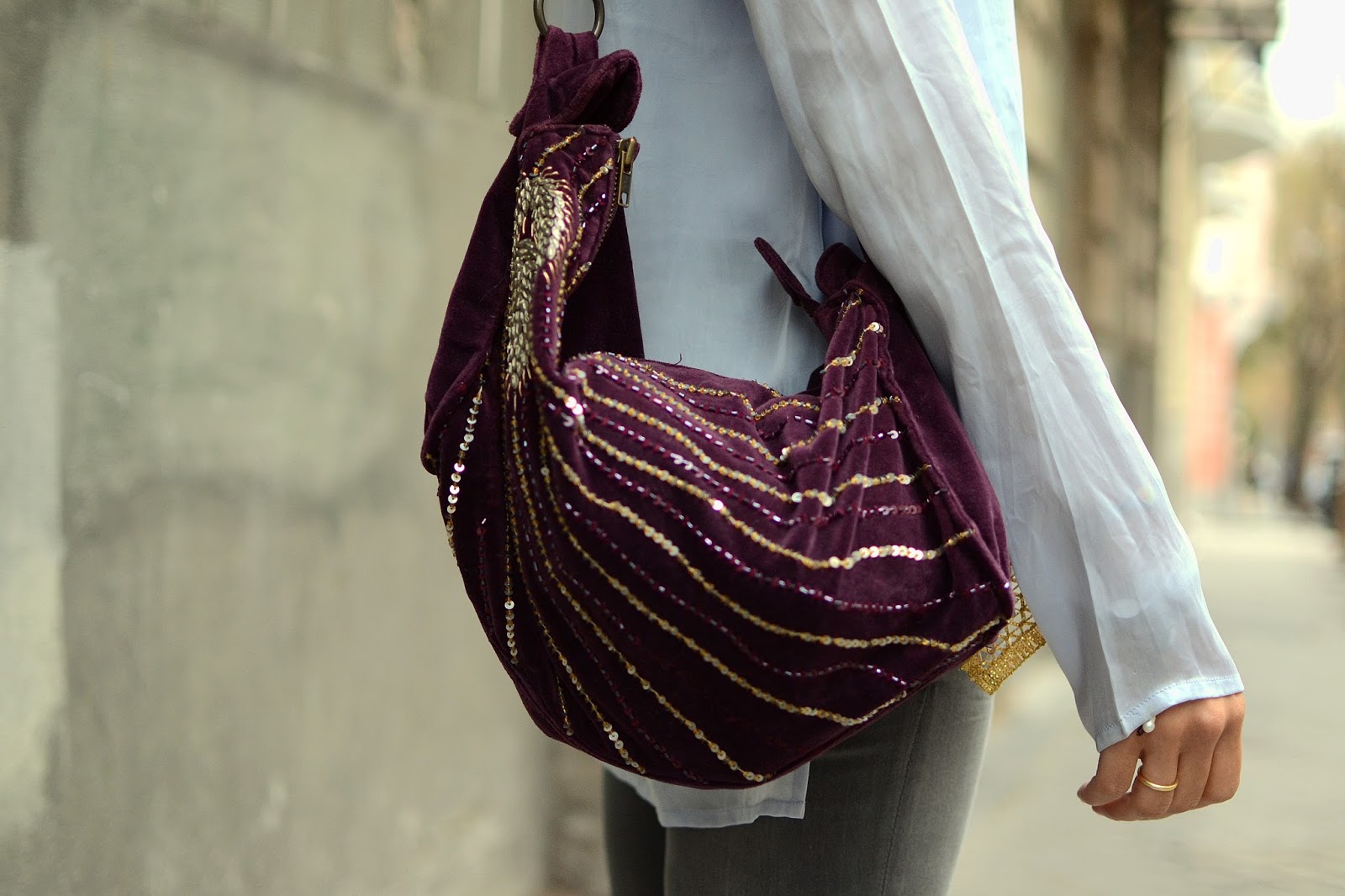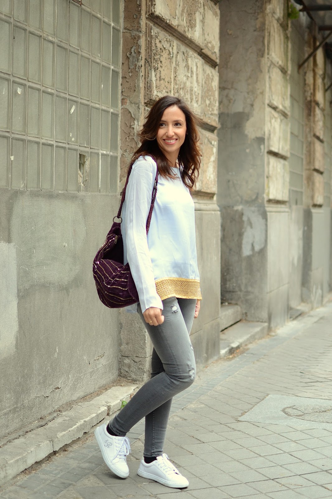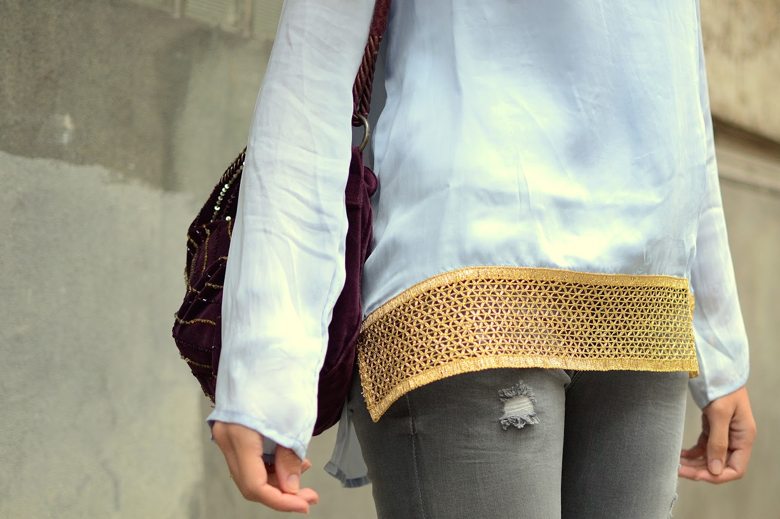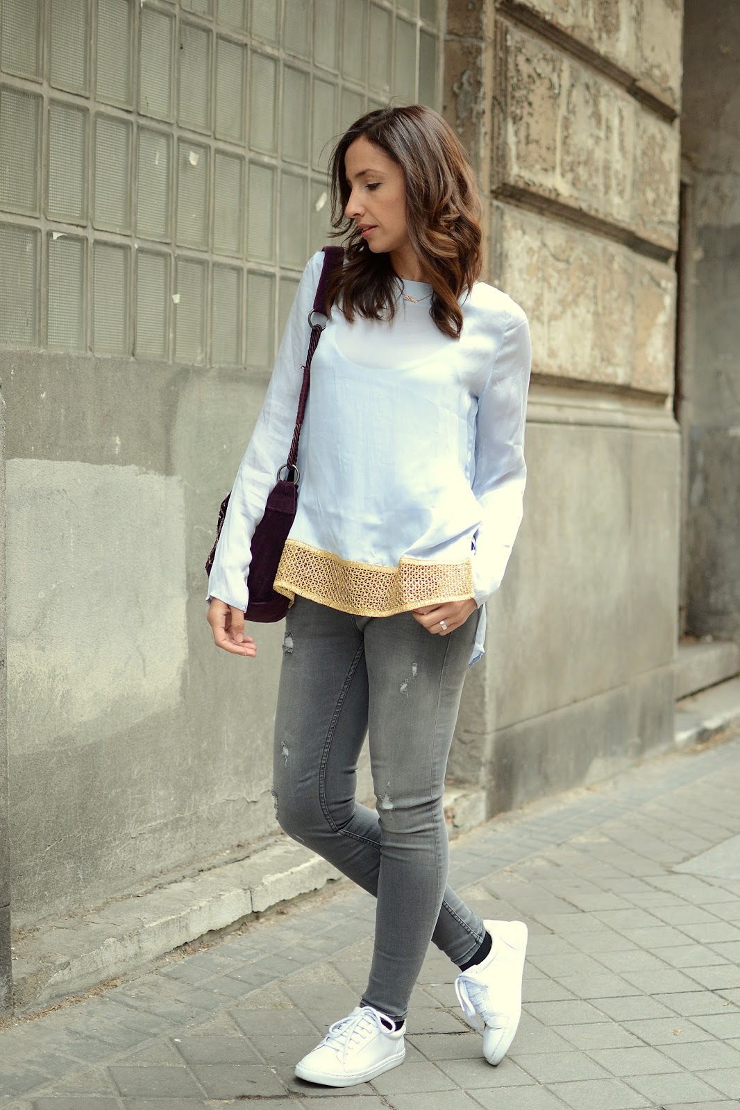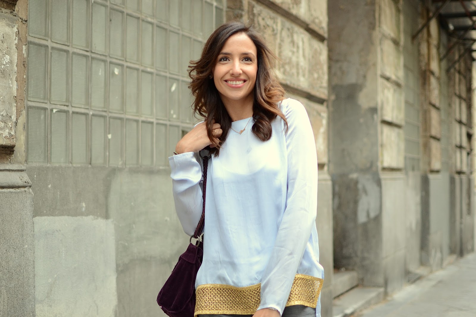El look de hoy es muy sencillo pero con detalles muy especiales. Llevo una blusa de seda en un bonito tono celeste con una cenefa dorada en el bajo, de la firma francesa Ella Luna. Esta blusa es ideal para el entretiempo y también para cuando llegue más el verano. Ya me veréis con esta blusa en un look más playero con sombrero y todo :). En esta ocasión la llevo con mis nuevos jeans, de Zara, unas zapatillas customizadas con mis iniciales, de Promod y un bolso con detalles bordados de hace algún tiempo pero me encanta, es de Massimo Dutti.