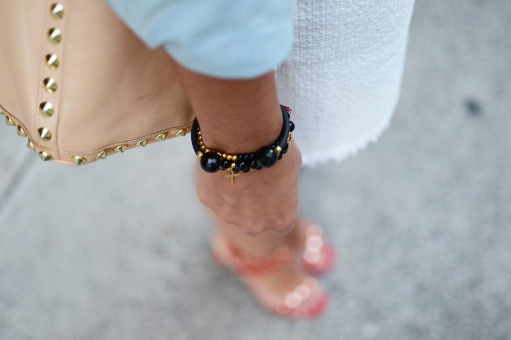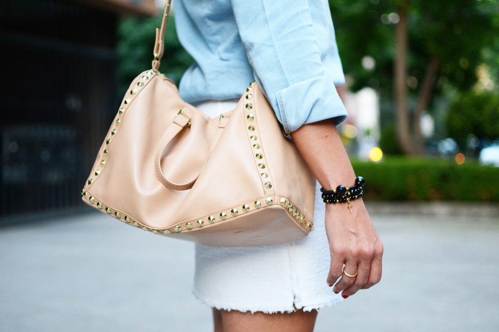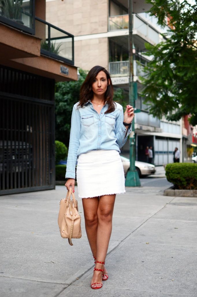 Aquí en México no se usan mucho las mini faldas pero a mi me gustan mucho y creo q en este look queda perfecta. Llevo una mini falda de tweed en color blanca y una camisa denim, ambos de Zara. La camisa denim le quita formalidad a la mini y le da un toque muy especial. Para dar un poco de color al look me puse mis nuevas sandalias de Hoss Intropia, y como tienen unas tachitas me decidí por este bolso, de Zara, que también tiene. Un look muy trendy, no creéis?