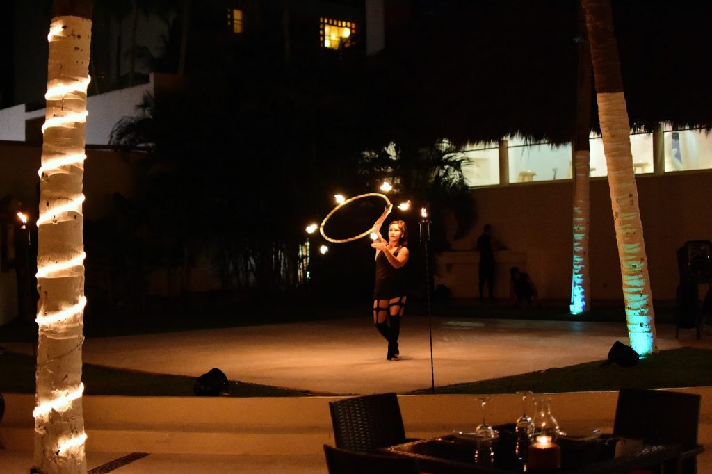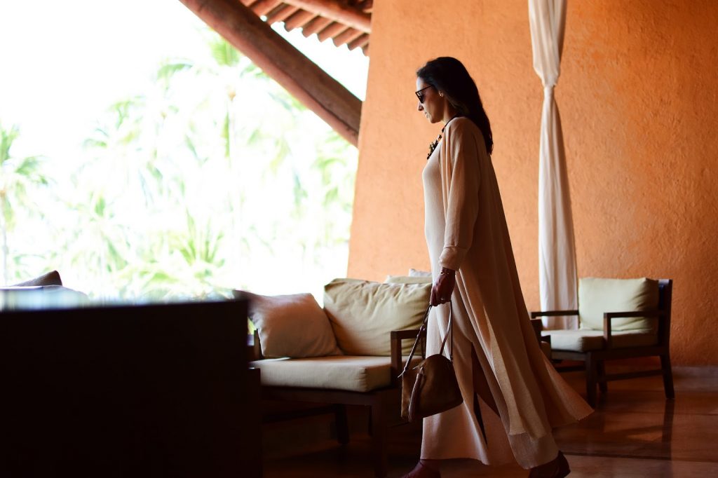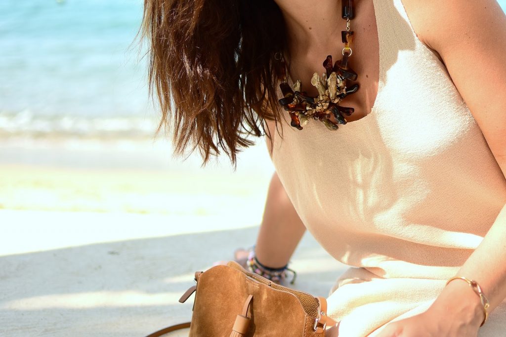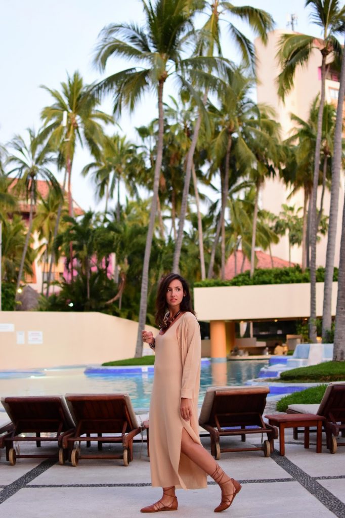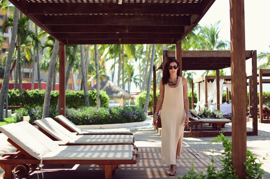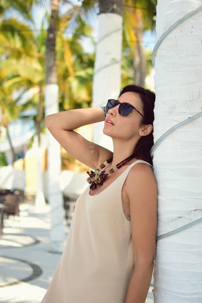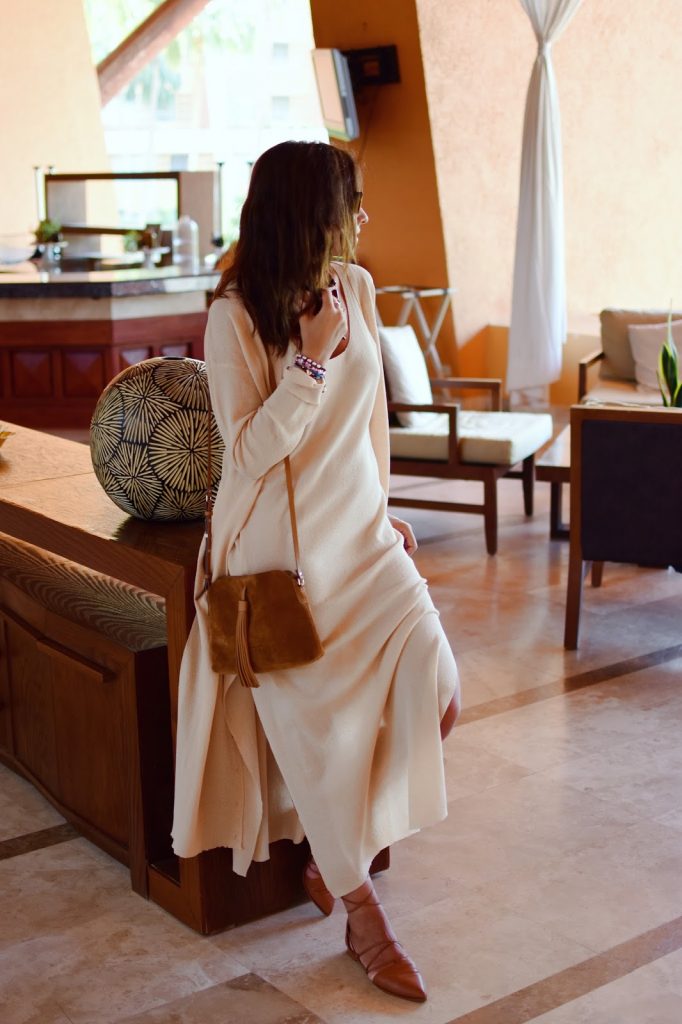 Todo el resto del día transcurrió entre la piscina y la playa para terminar con una romántica cena, al aire libre, con show de fuegos y musica en vivo en el Restaurante Arrecifes de Mariscos y Carnes. El look que elegí para esta ocasión tan especial con mi marido, fue un total look de Adolfo Dominguez, compuesto por un vestido de punto muy soft y un maxi cardigan igual que el vestido, por si la noche refrescaba, ya que estábamos al lado del mar. Los complementos eran unos zapatos planos con tiras al tobillo, bolso de ante en color camel, y un collar con inspiración coralina.