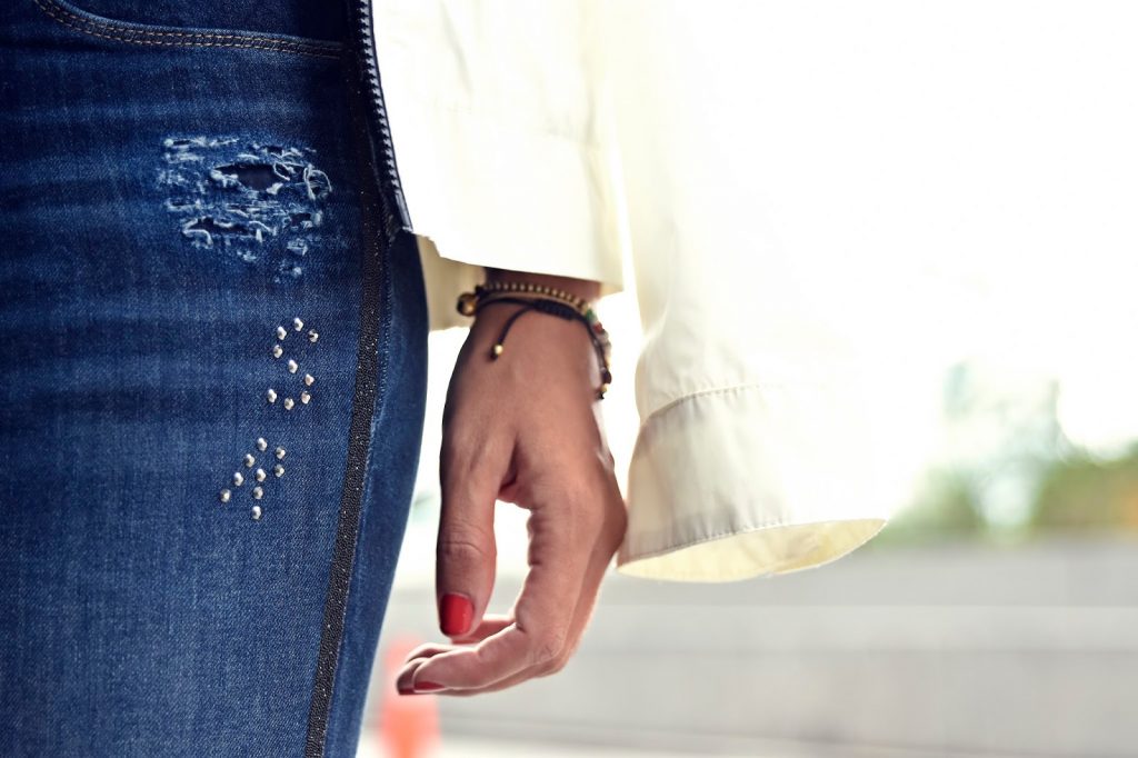 Hi! Few days ago, I wanted to show you these pictures, for many things. I´m wearing my news customized jeans by Liu jo. A few weeks ago, the artisans of Liu Jo made my customized jeans on the flag ship of Madrid. I am very happy with them because they are my initials SR 🙂