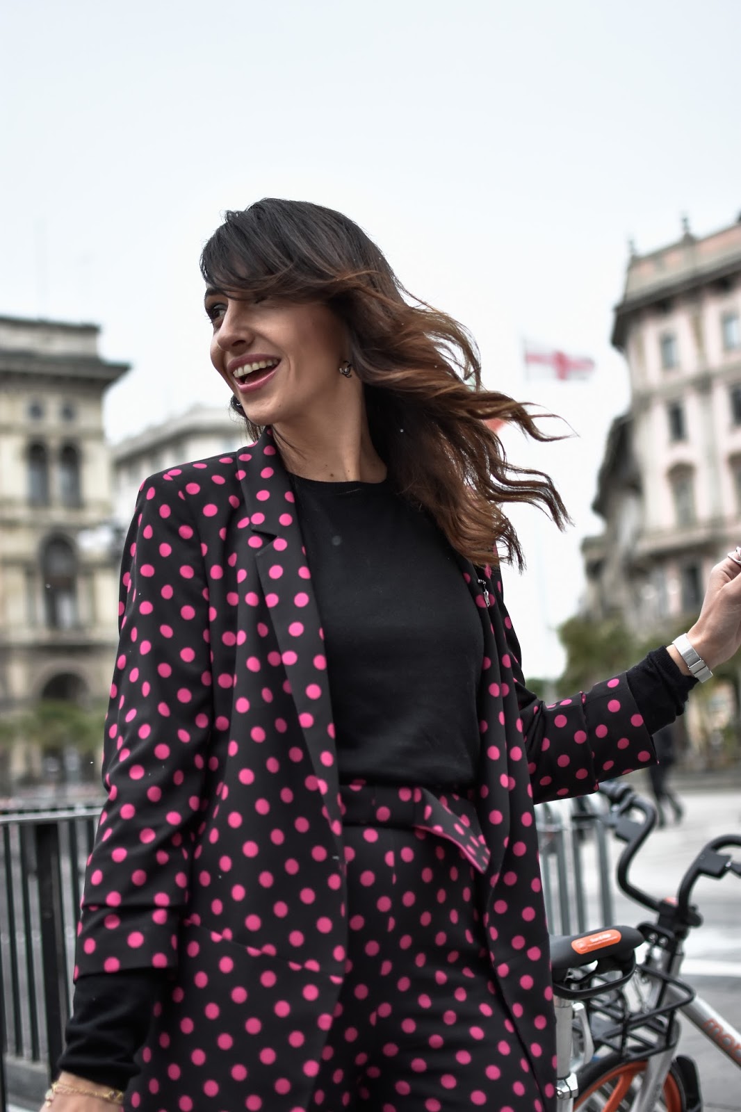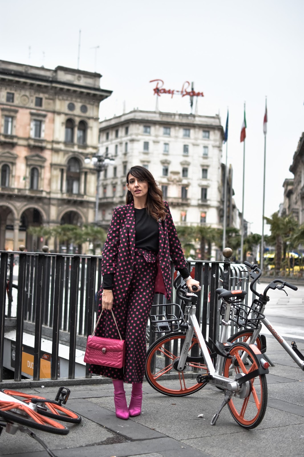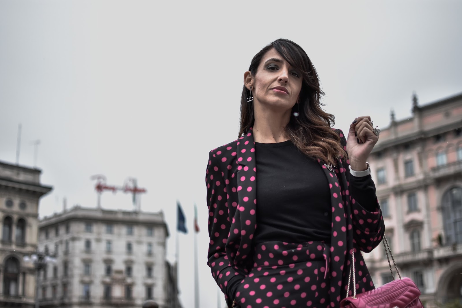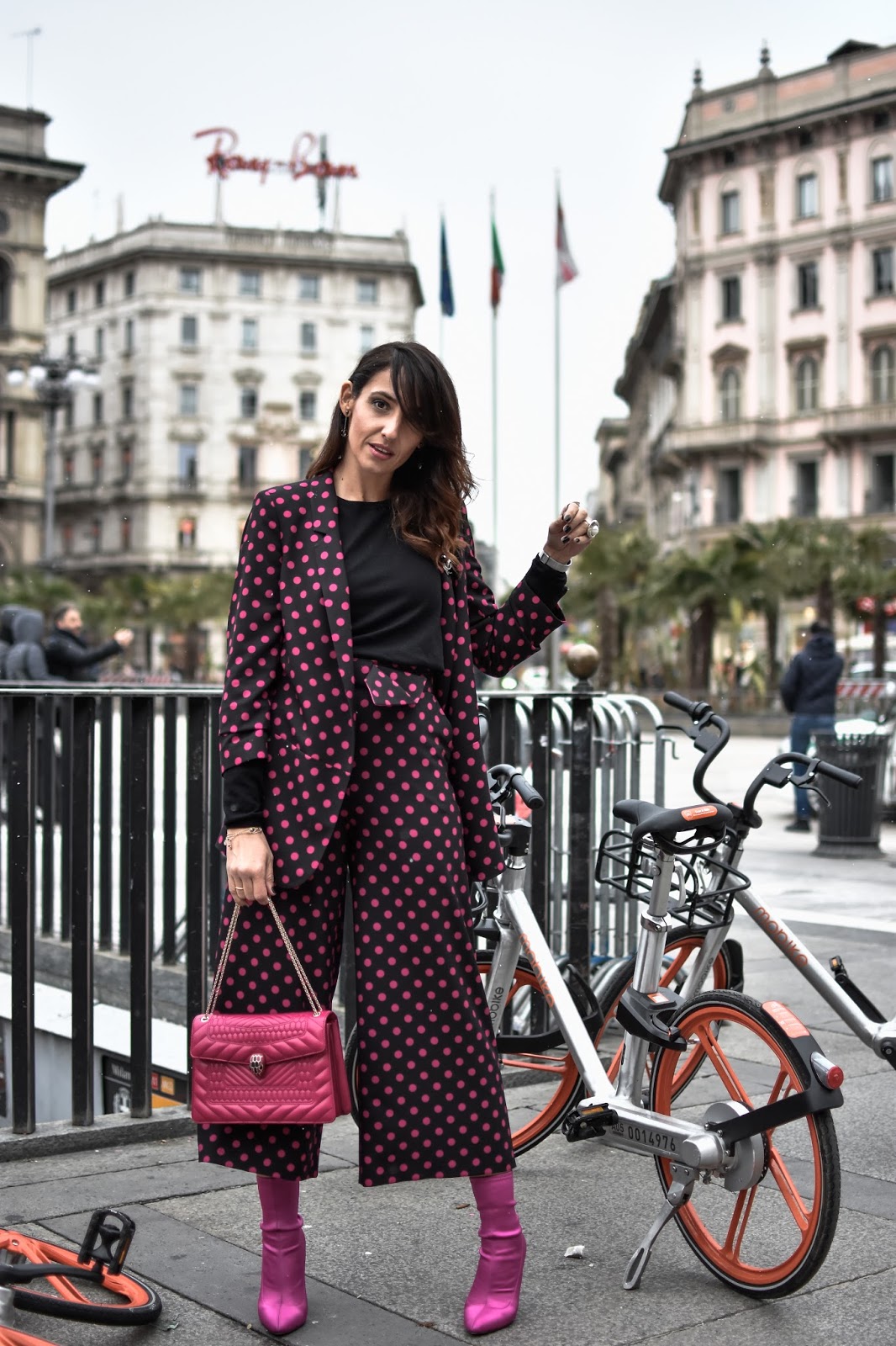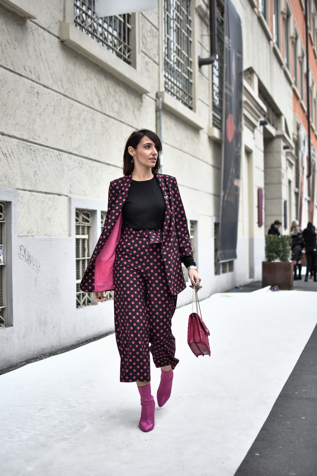 Para esta ocasión, a pesar del frío, elegí un traje, pantalón y chaqueta, de Dandara, de la nueva colección, inspiración primaveral, lunares en fucsia con fondo negro, pantalon culotte, y las condiciones meteorológicas me obligaron a ponerme un básico negro abajo. Los complementos los elegí con mucho mimo, y como Milán se merece para su semana de la moda. Llevé un Serpenti Forever de Bulgari en fucsia, toda una joya hecha bolso, que combinaba a la perfección con mi look. Además añadí al look unos pendientes con broche a juego, de Chanel y unos botines fucsia de satén, de Amazon Fashion.