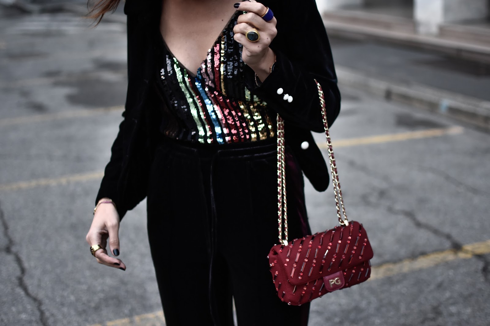 Y dicho esto, ya solo me queda contaros el resto del look. llevé un body de lentejuelas de hace ya meses pero nunca lo había usado y a un look total black le daba mucha vida. tanto la chaqueta, de Blugirl Folies, como el pantalón, de BDBA, son de terciopelo o velvet como le llaman ahora. Y el bolso de pedrería es de Purificación García.