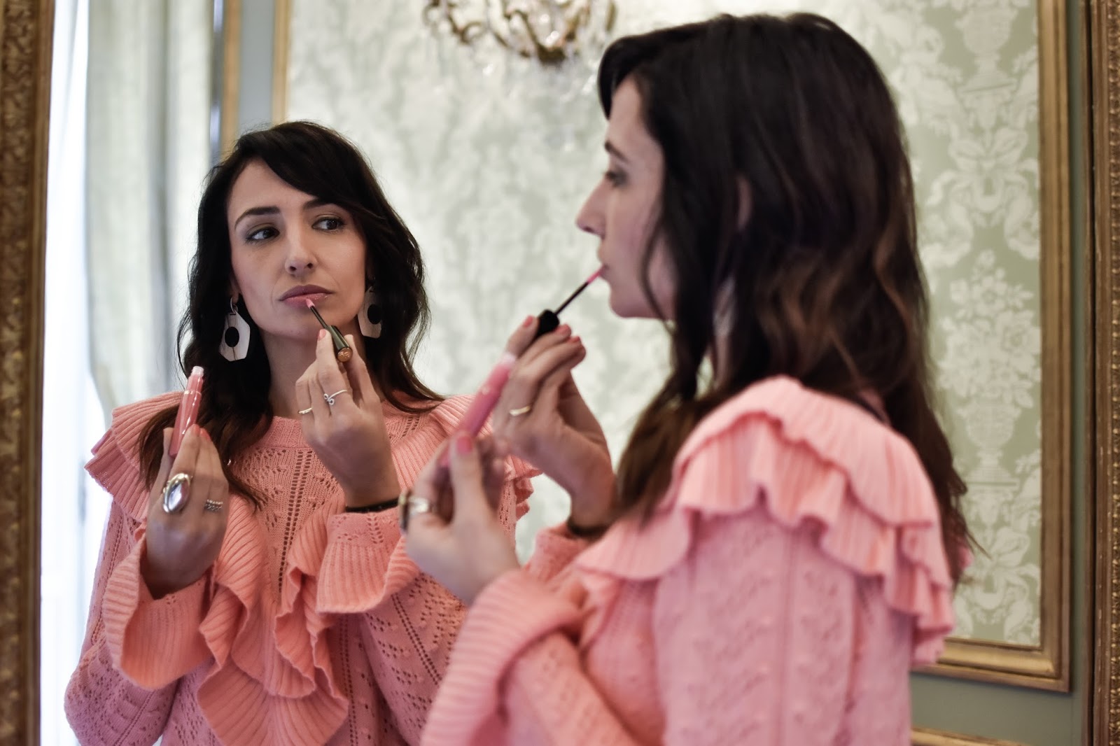 Para esta ocasión, fui vestida de dos de las marcas de la web de Revolve, el jersey rosa es de Tularosa y los jeans de GRLFRND. El resto de look son unos pendientes de Mango, un bolso de piel de serpiente de Bulgari, y unos botines blancos.