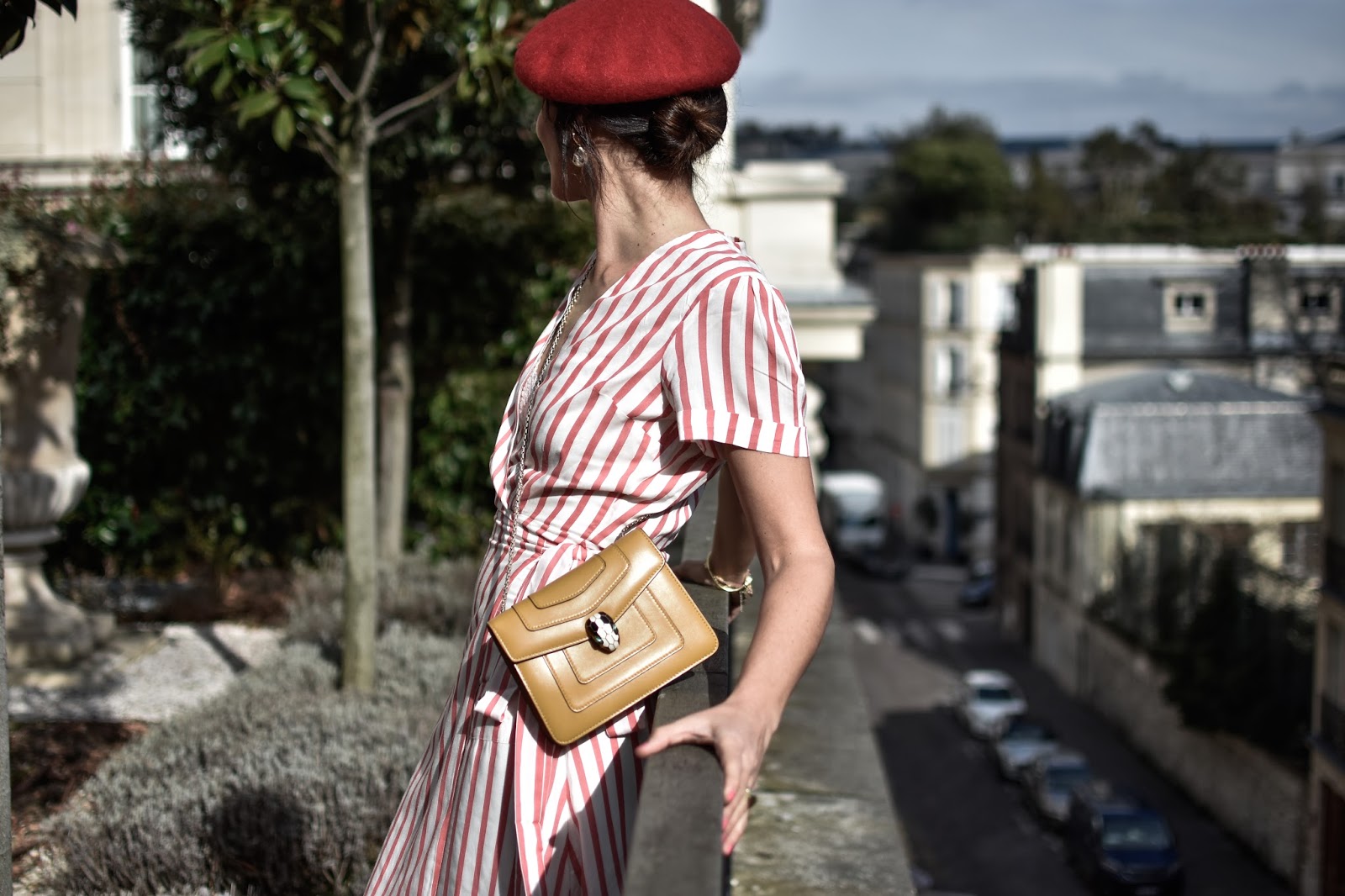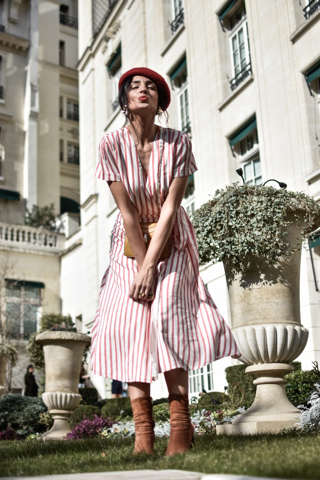 Para este día elegí un vestido de corte midi, con rayas rojas de la marca L´Academie, que podéis encontrar en la web de Revolve. El resto del look fue una coqueta boina de BDBA, unos botines de ante camel, y pendientes de Mango. Ahora, a seguir disfrutando de la Semana Santa!