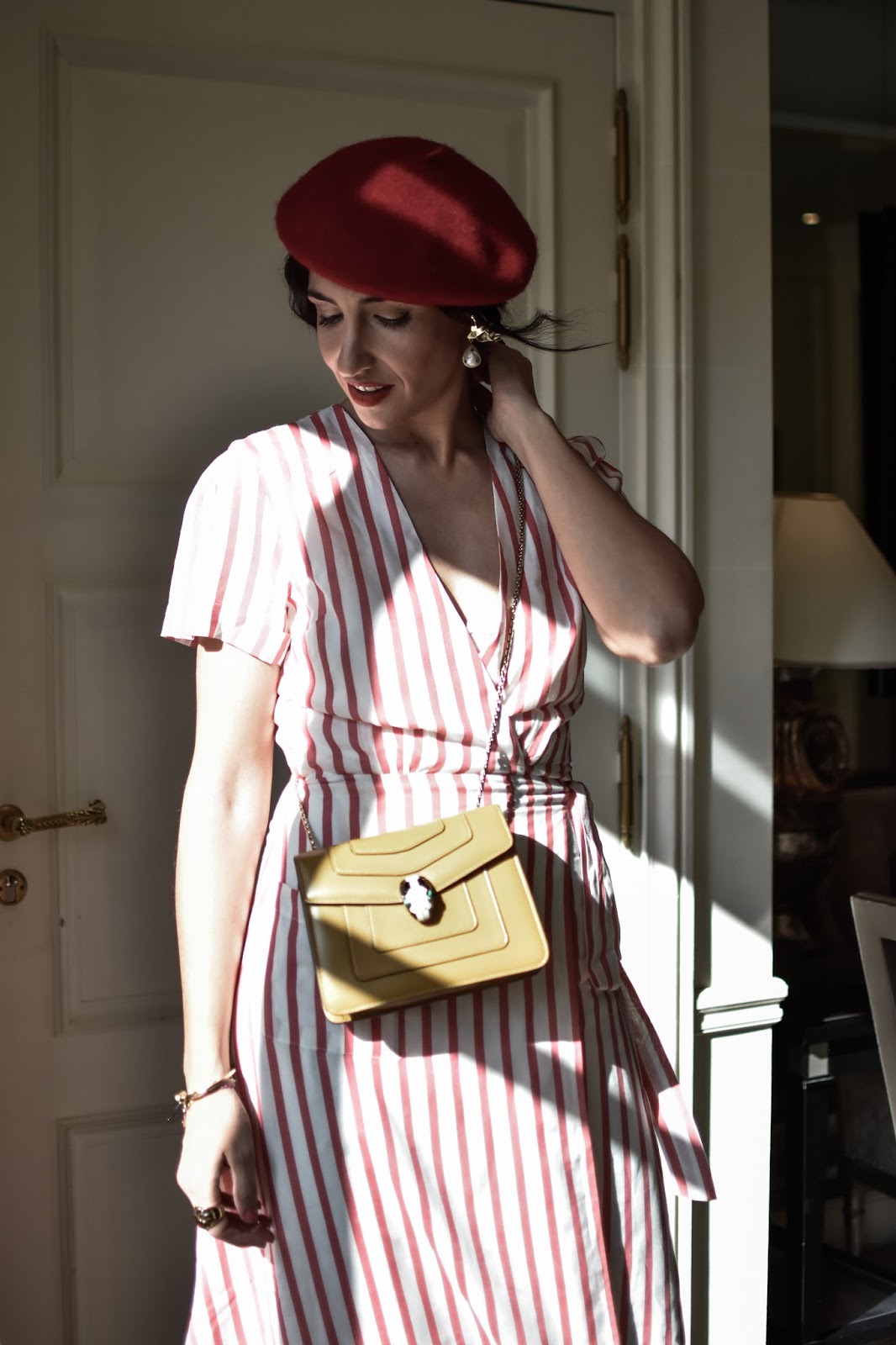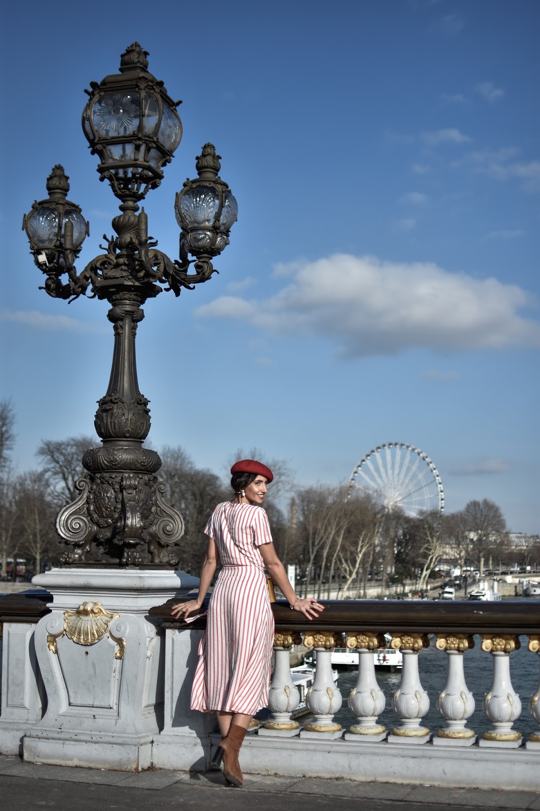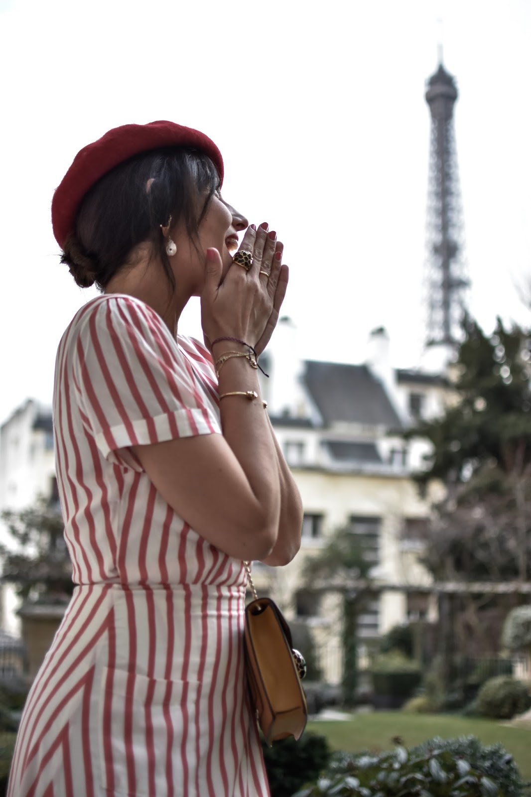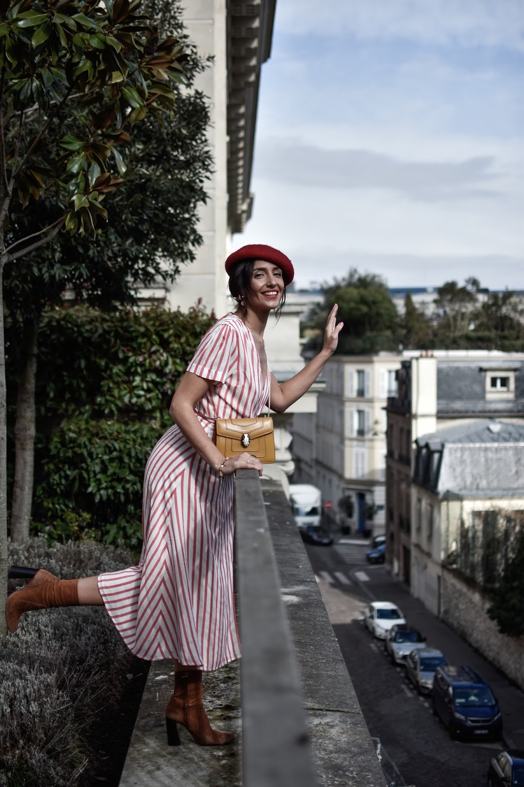 Para este día elegí un vestido de corte midi, con rayas rojas de la marca L´Academie, que podéis encontrar en la web de Revolve. El resto del look fue una coqueta boina de BDBA, unos botines de ante camel, y pendientes de Mango. Ahora, a seguir disfrutando de la Semana Santa!