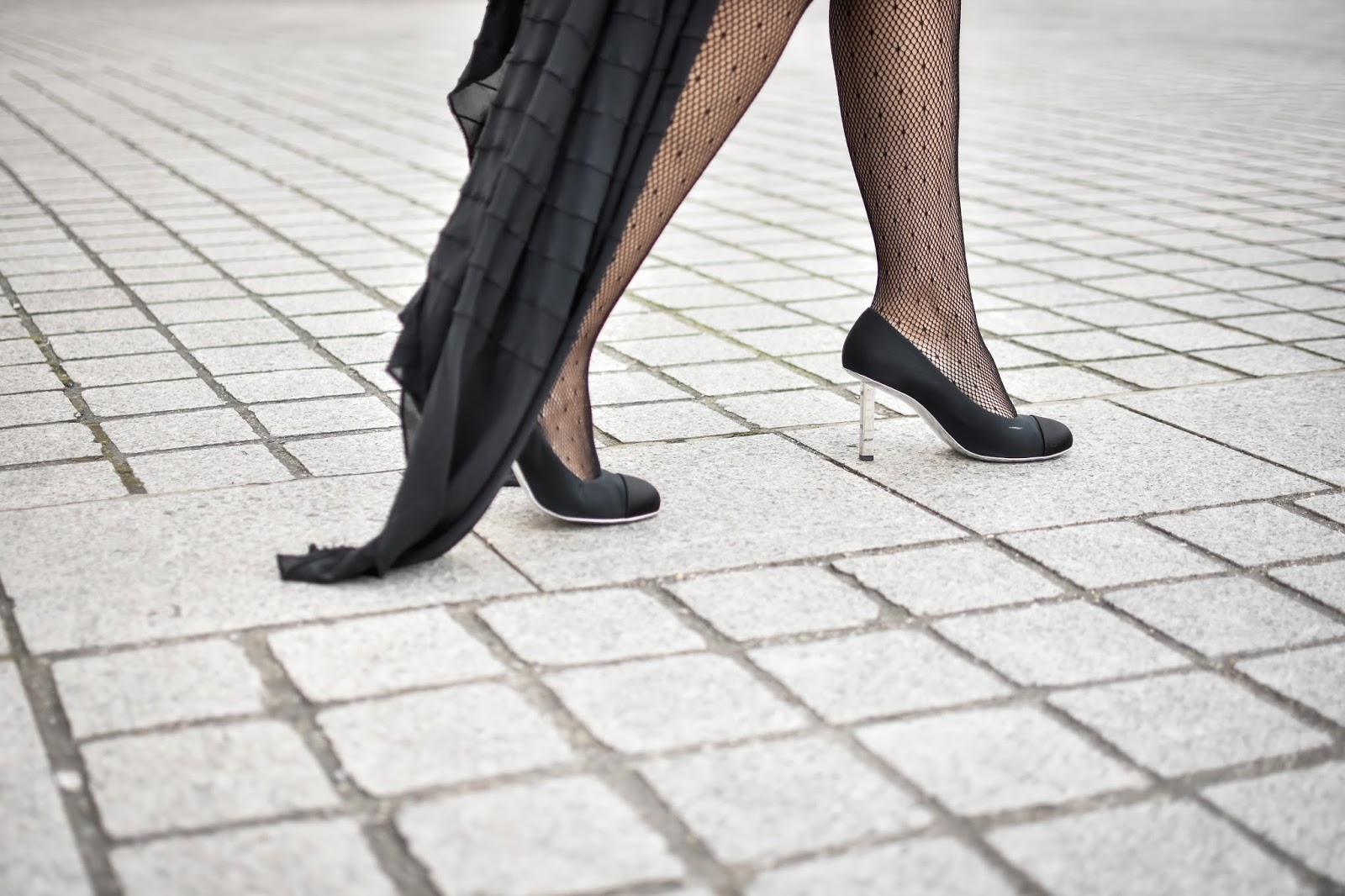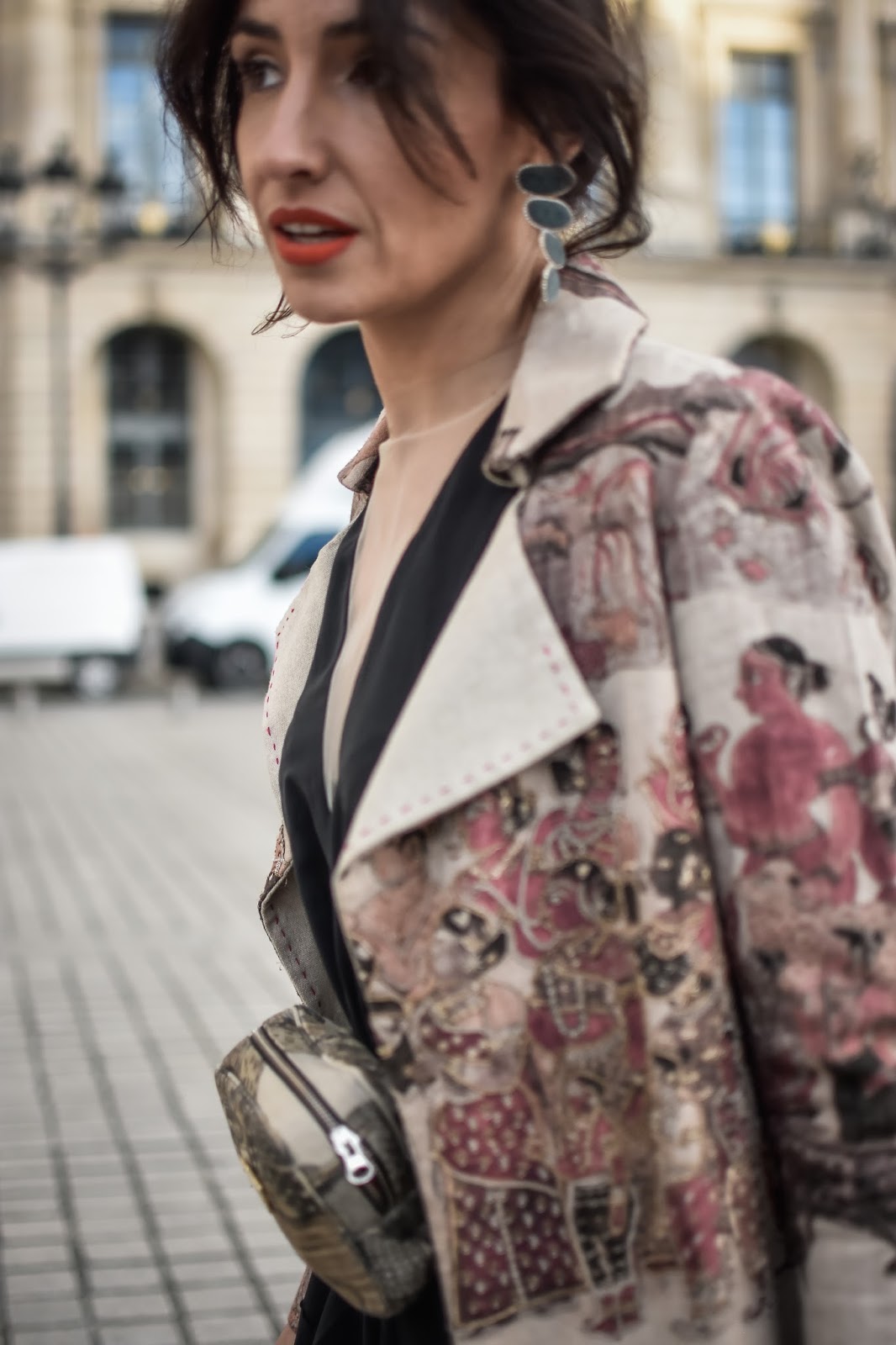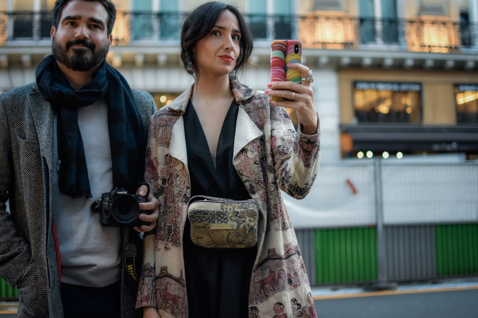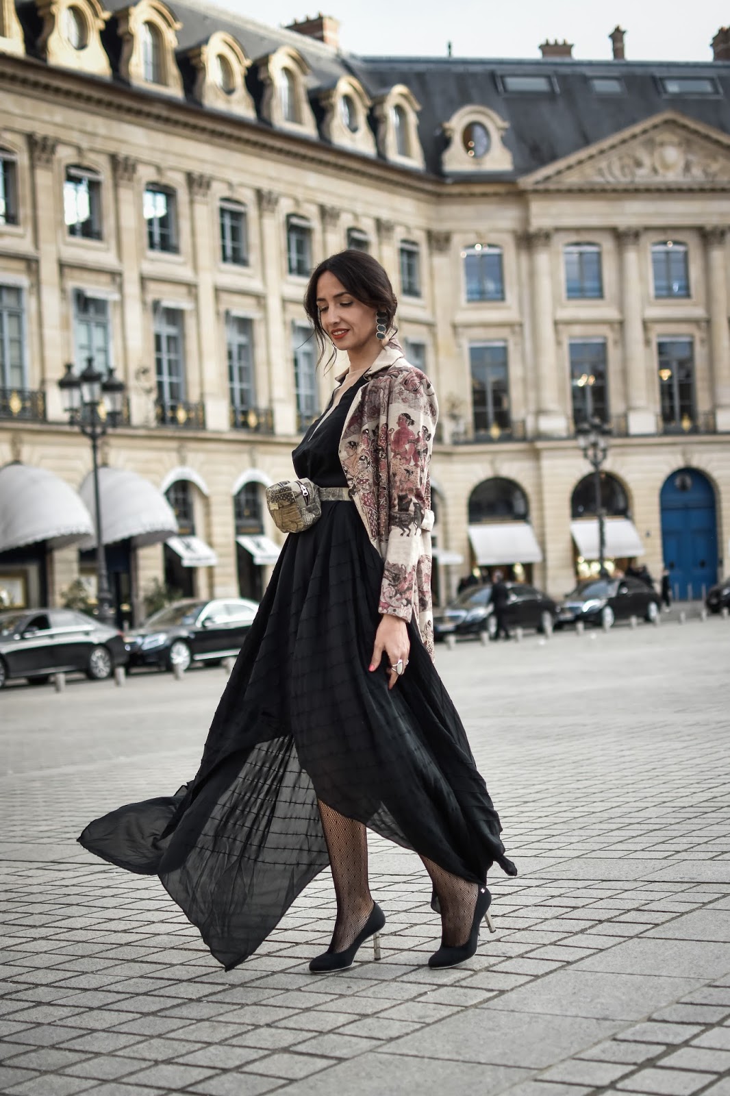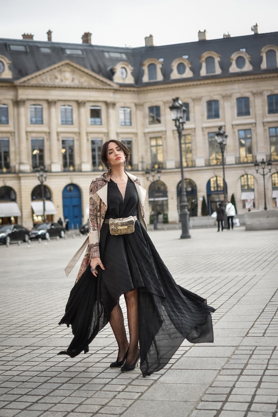 Tanto mi vestido negro, de largo desigual y escote en V transparente, como el trench bordado y con incrustaciones de pedrería, como la riñonera son piezas de la diseñadora Esha. Combiné el look con unas medias de red negras y unos zapatos de Chanel, para hacer honor a la ciudad en la que estábamos.