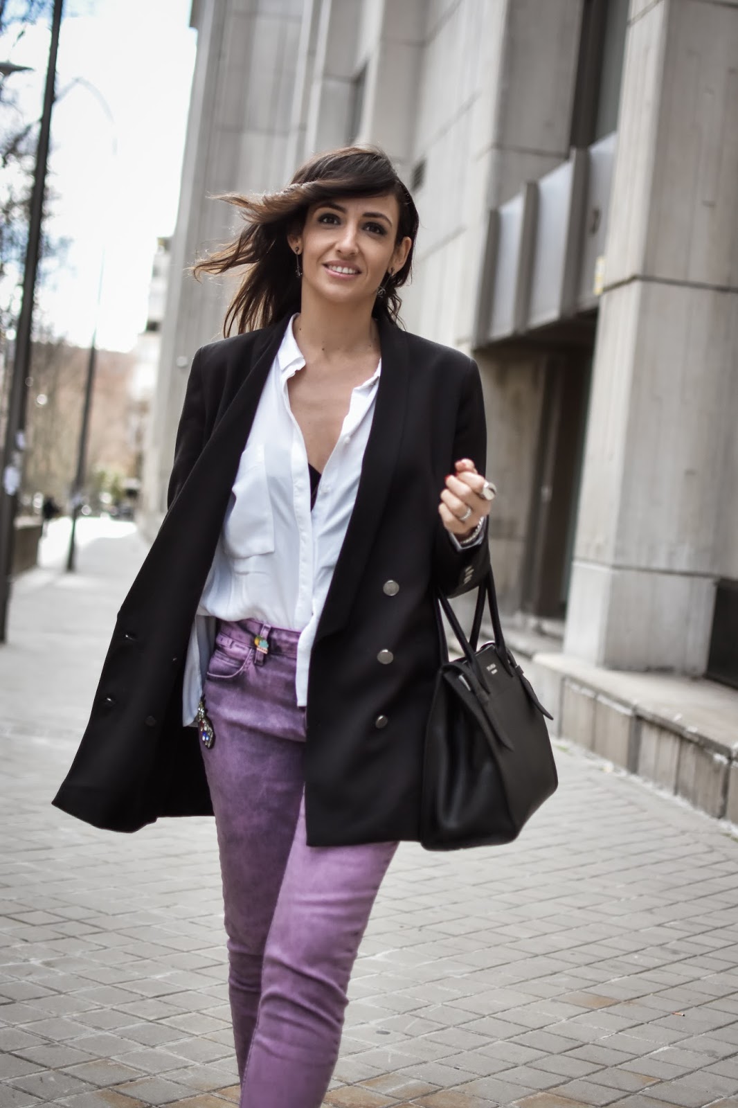 El resto del look es una blusa blanca oversize de Mango que me la pongo con todo, es uno de mis imprescindibles de fondo de armario. Una cosa que está muy en tendencia es enseñar el bralette, vaya que ahora es mejor llevar uno bien bonito porque hay que lucirlo, este que yo llevo es de Revolve. La blazer es de ST Studio, los pendientes de Chanel, anillo de Daniel Espinosa y Pandora, zapatos de Zara, y mi querido y amado bolso de Prada, cómodo y funcional como ninguno, es ideal para el día a día, para la oficina, en definitiva, para toda una working girl.