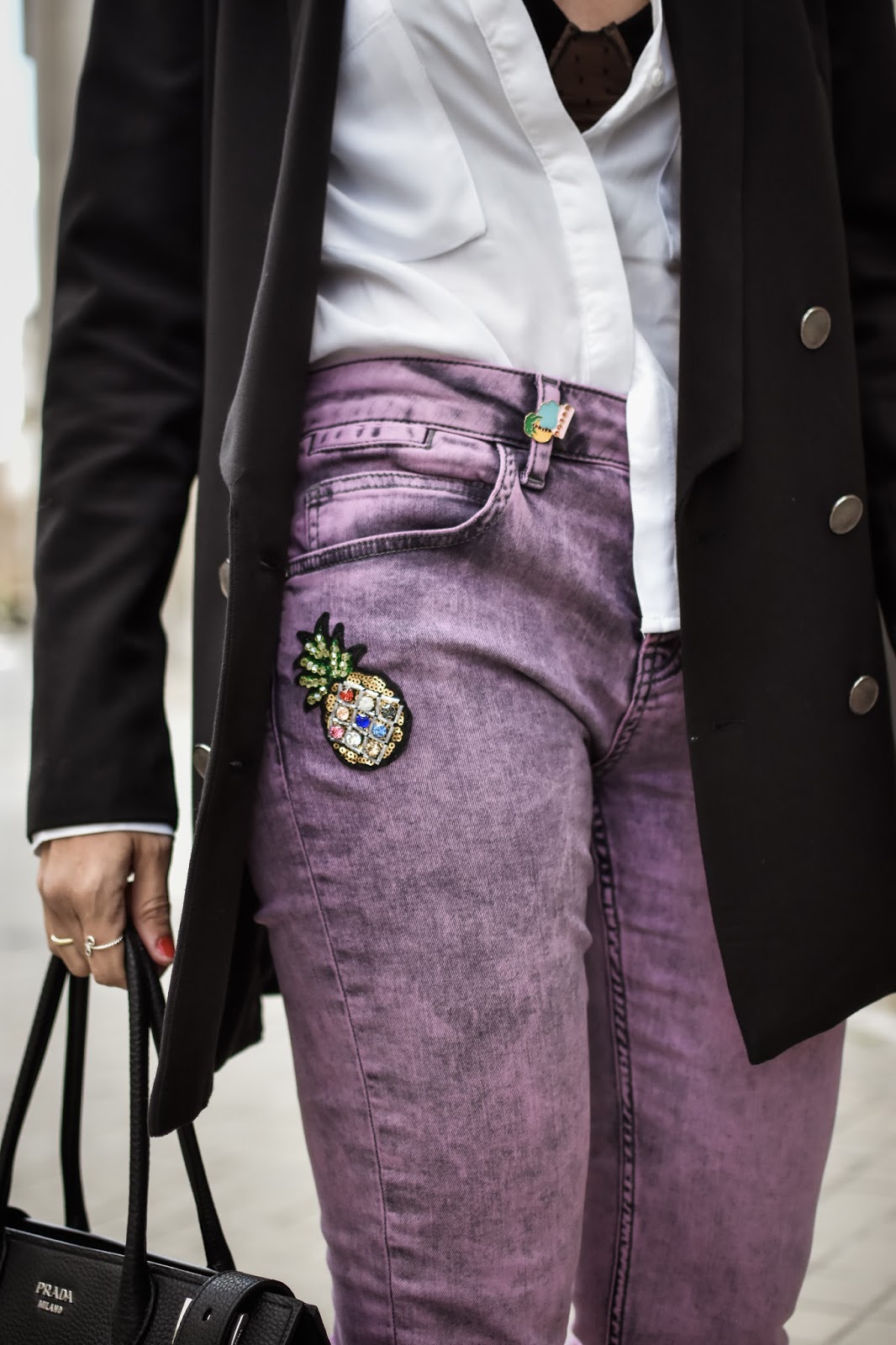 Buenos días! que tal estáis? Yo muy feliz porque ya, si que si, llegó la primavera! Ya no puedo más con los jersey de invierno, los abrigos de pelo y las botas… solo me apetece ponerme sandalias, gafas de sol y vestidos estampados! Pero bueno, hay que ir poco a poco introduciendo prendas más divertidas y coloridas en el look, así que, a ver que os parece mi look de hoy.La estrella del look, sin duda alguna, son estos jeans rosas con parches super veraniegos como un helado, una piña… y son de una marca de la que ya os he hablado en varias ocasiones, Rich & Royal. Es de mis marcas favoritas para jeans, camisetas… tienen cosas super monas.