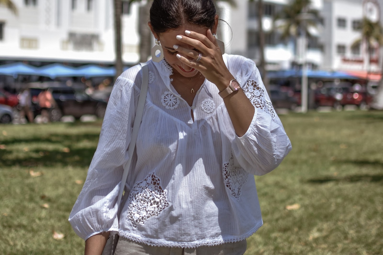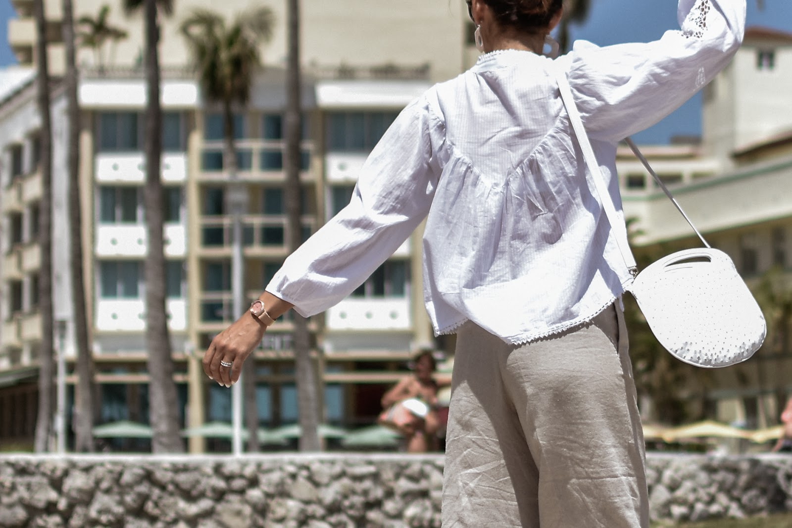 El resto del look fue un blusa blanca de Zara, pantalones de lino de Esprit, sandalias de Tory Burch y un precioso bolso de Jellymoon.