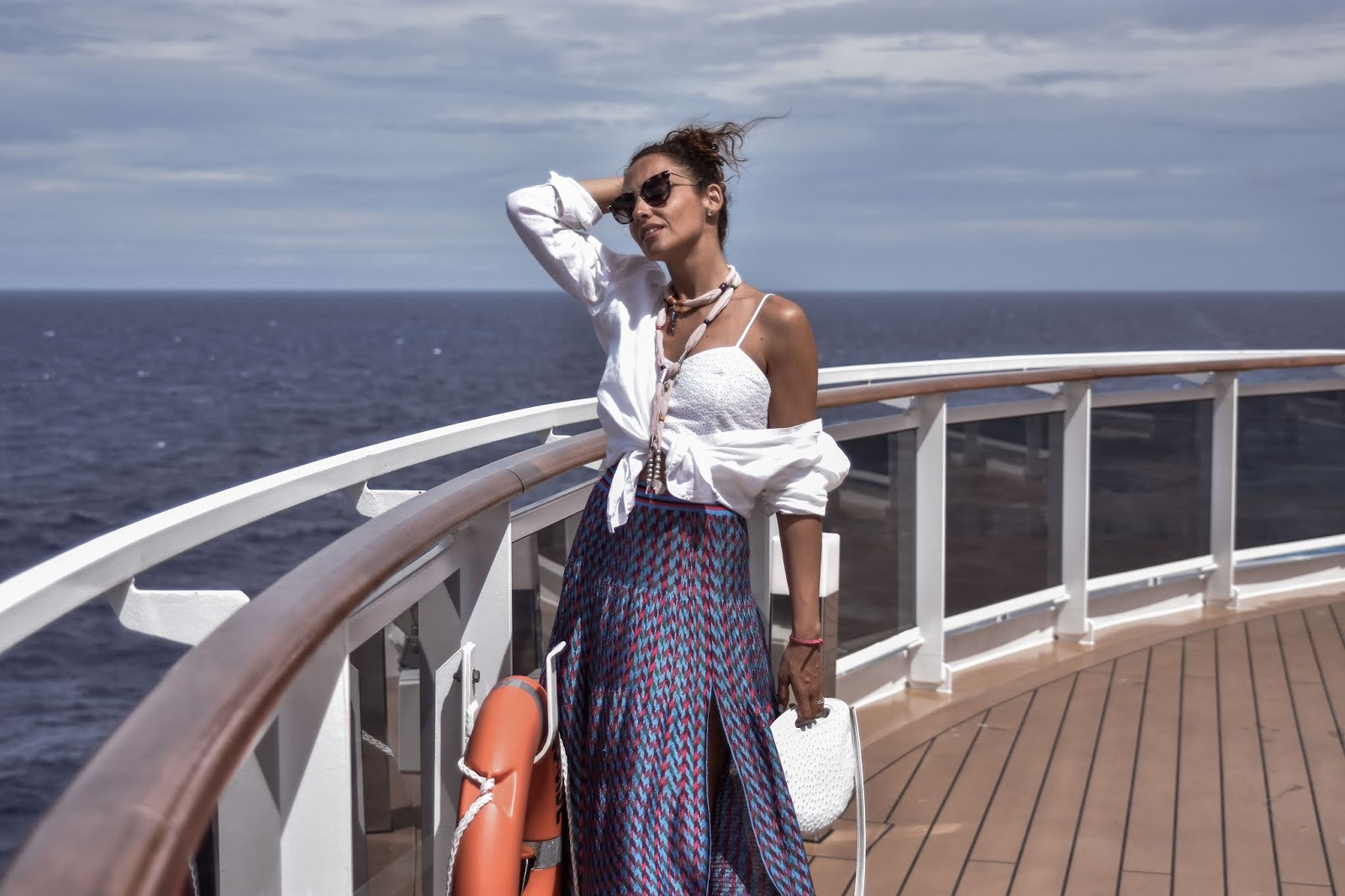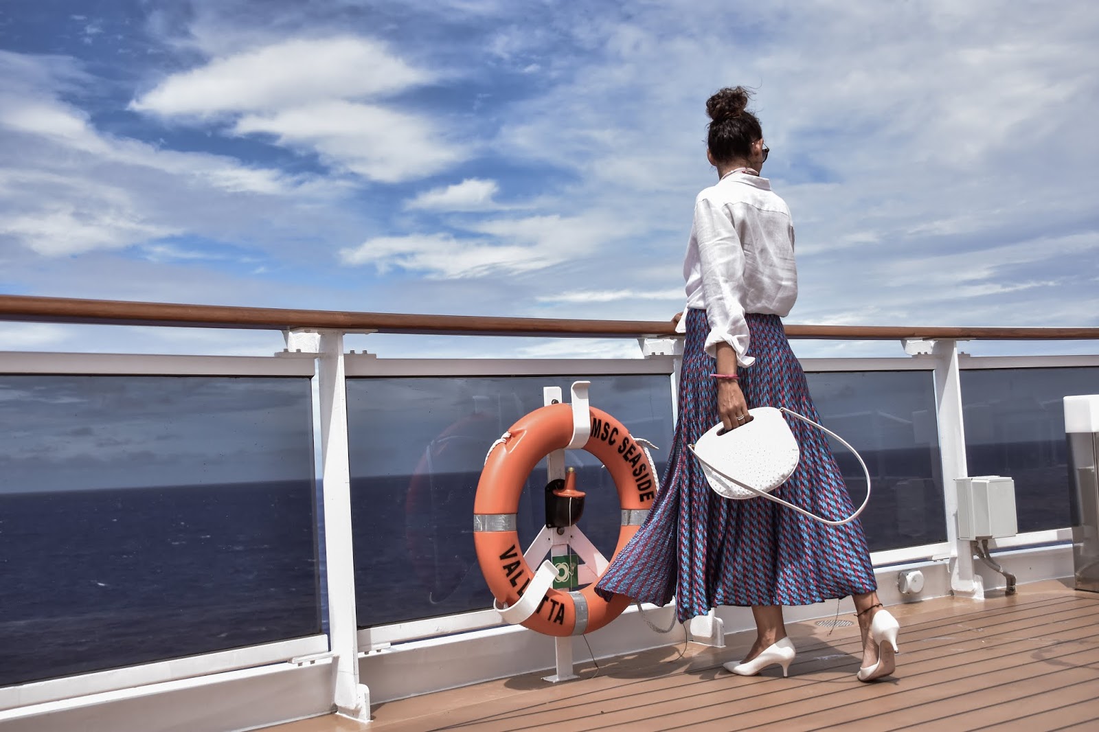 Sobran las palabras para imaginar que he disfrutado como nadie de estas instalaciones ya que, aunque este de viaje, para mi es super importante seguir mi rutina de cuidados.Pues dicho esto, os dejo unas fotos muy bonitas que hicimos en MSC Seaside, donde mi look fue un top calado blanco con una blusa de lino encima anudada a la cintura, y una falda larga hasta el tobillo en tonos azules y fucsia, todo ello de Zara. El resto del look fueron unos maravillosos zapatos blancos, super de tendencia esta temporada, con tacón comodísimo, de Custom & Chic. El bolso es de una de mis nuevas marcas favoritas, se llama Jellymoon, y este modelo en Bobby, y además, os traigo una super sorpresa! Si tu también quieres tu Bobby de Jellymoon: