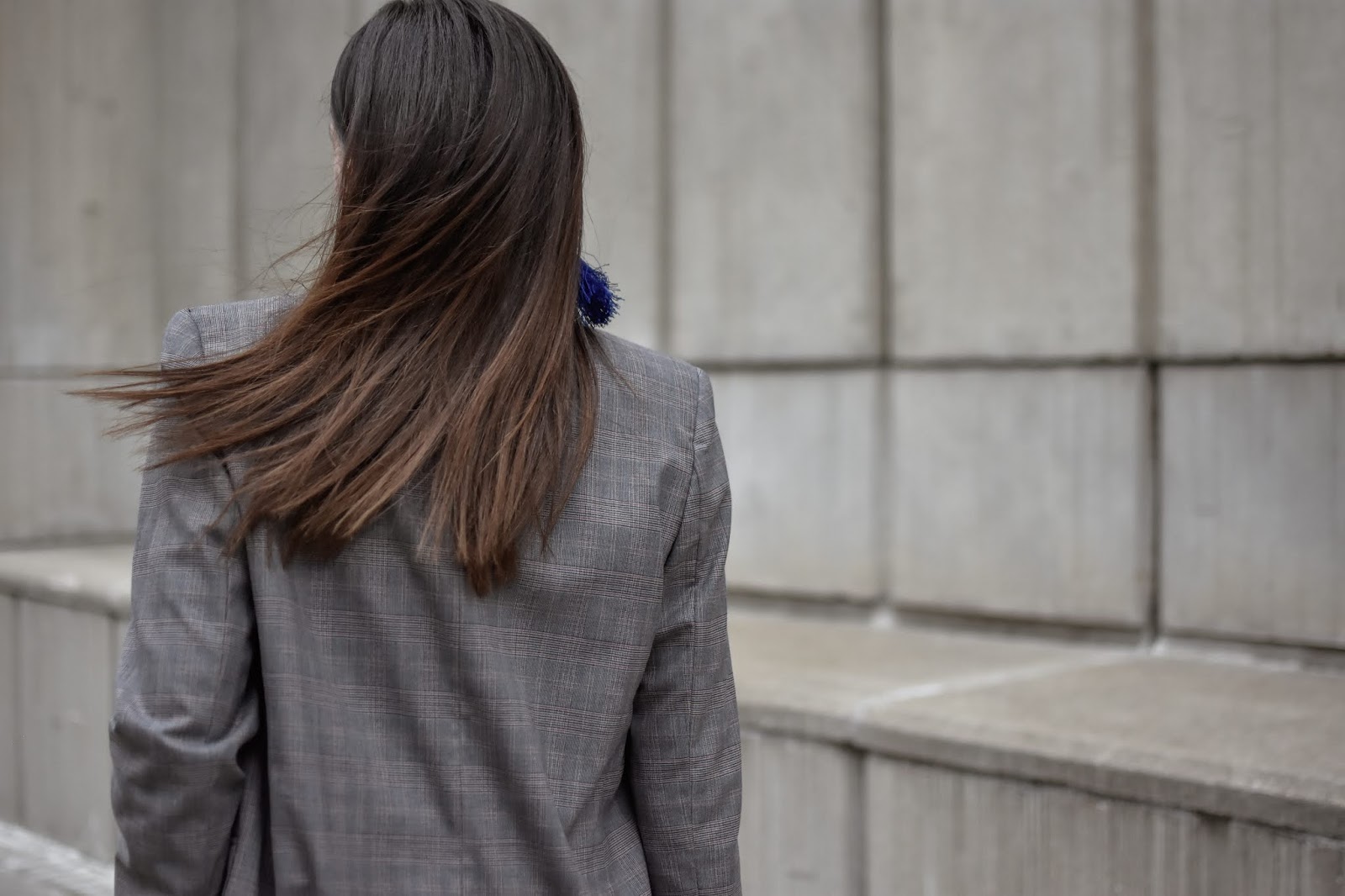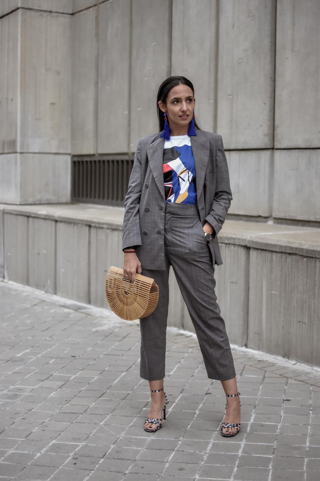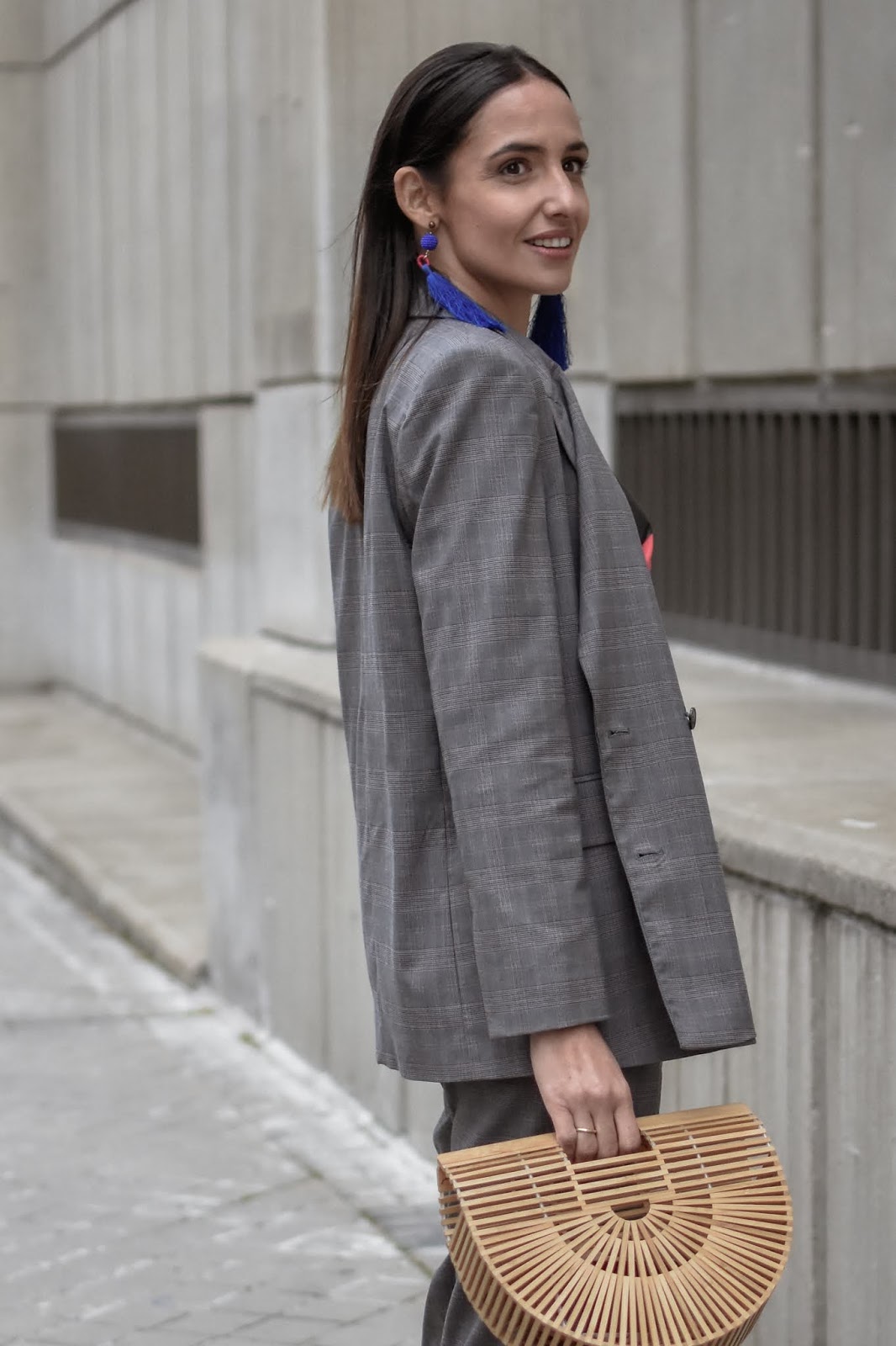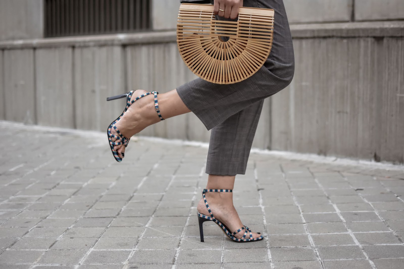Se trata de un traje masculino de cuadros, de Zara, que a priori puede resultar algo serio pero no lo es ya que sus pantalones son de talle alto, largo capri y la blazer recta y cruzada. El resto del look es una camiseta con un dibujo de zapatos muy original,unas sandalias de rayas de tacón medio para aguantar todo el día, y pendientes largos, todo de Zara y en los mismos tonos. El bolso es el icono del verano, de bambú y para llevar en la mano, es de K Bas.