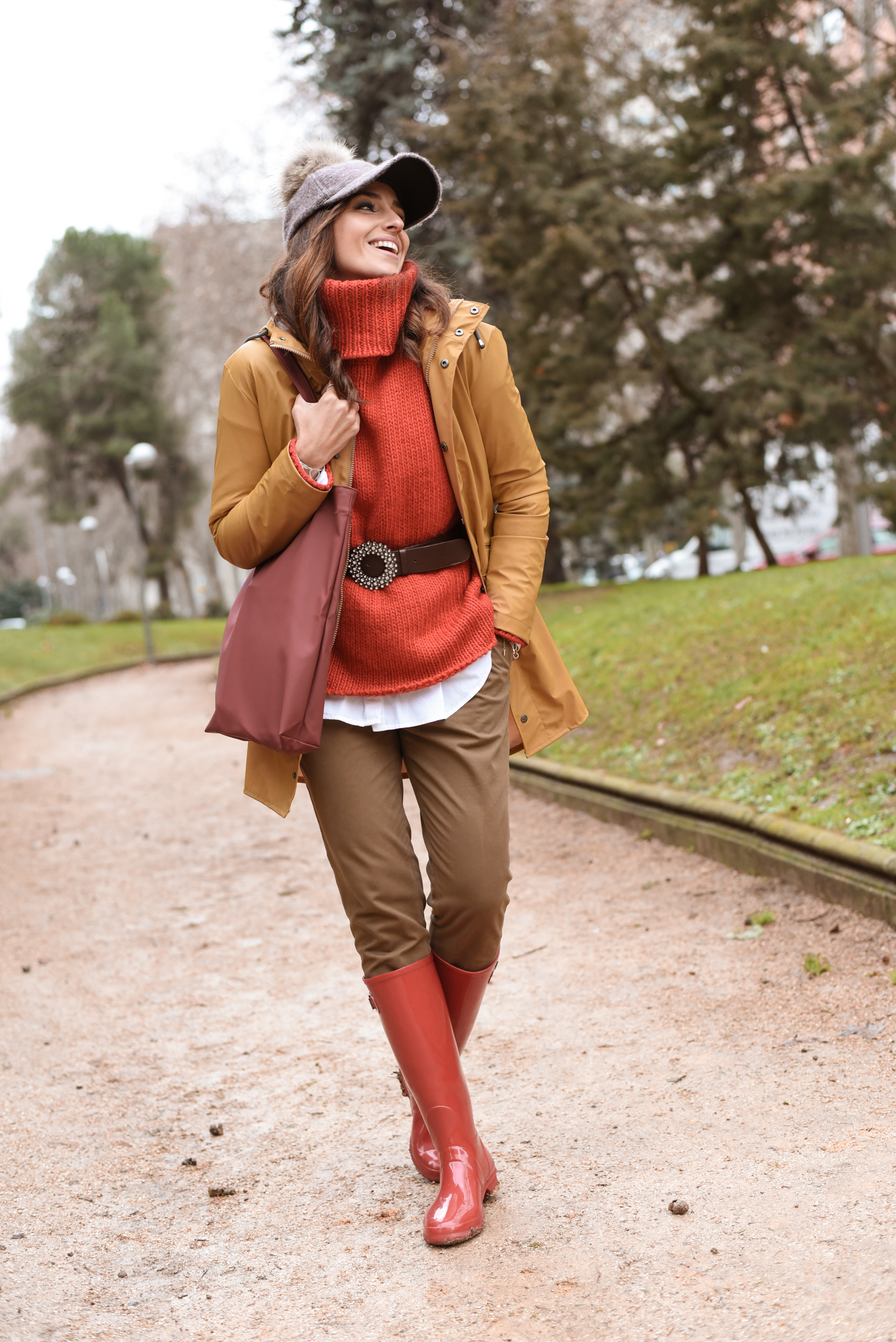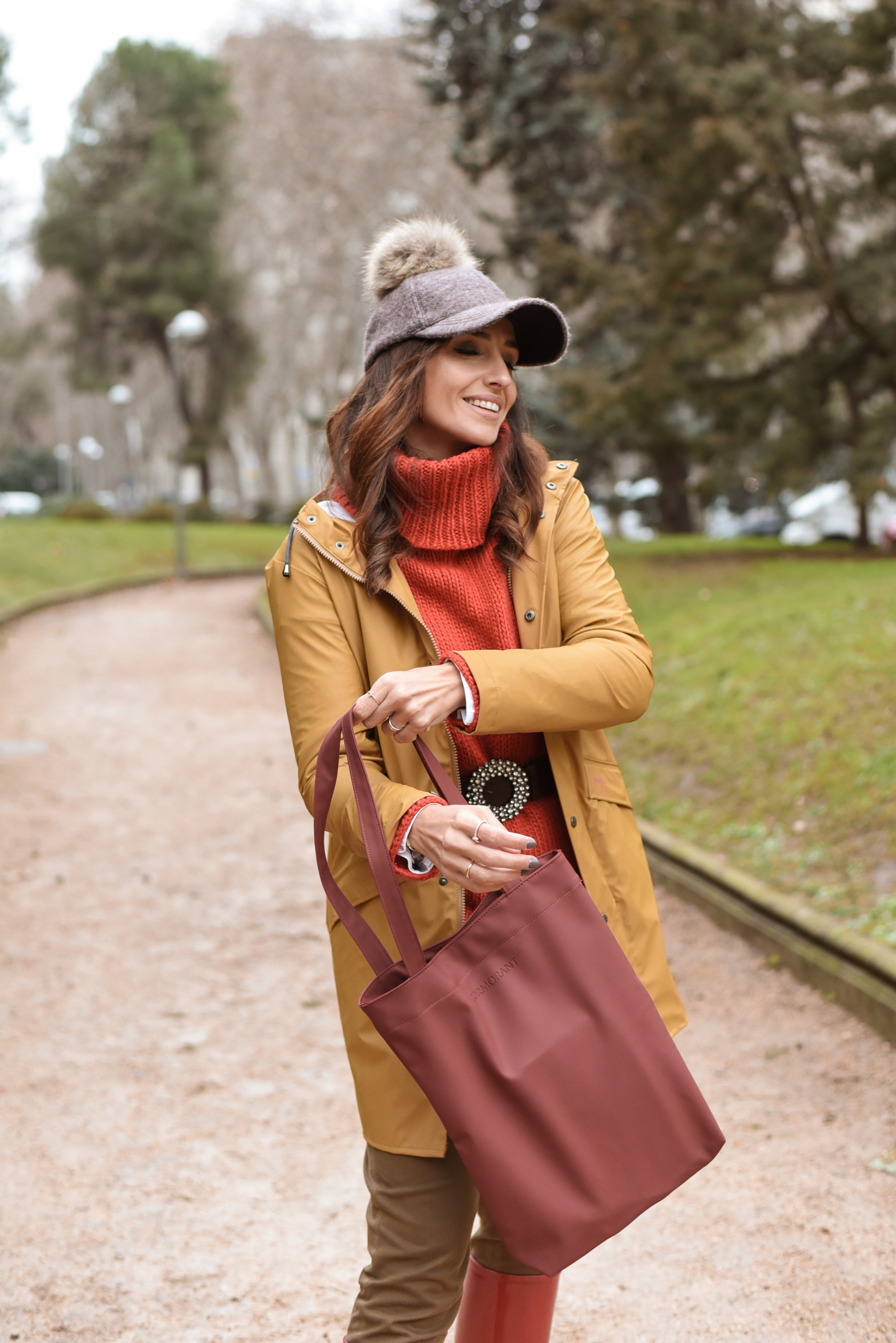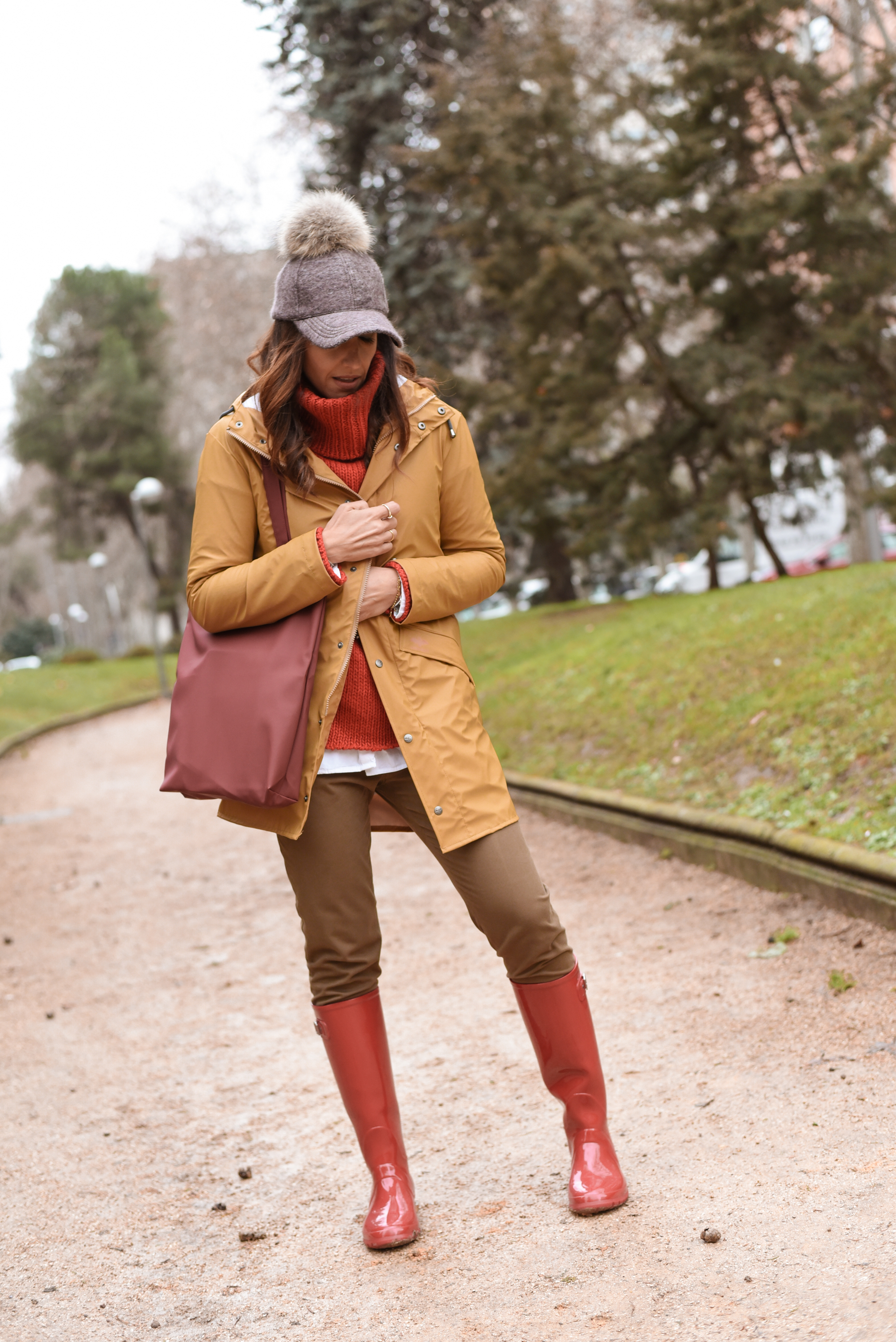 Pues ahora os cuento al detalle todo mi look. Para los días de lluvia optar por un gorro es una muy buena opción por lo que yo he elegido esta gorra con pompón que compré en un mercadillo navideño hace tiempo. Como a mi me gustan los looks coloridos, en este look mezclo el rojo con colores más tierra como marrón y mostaza.