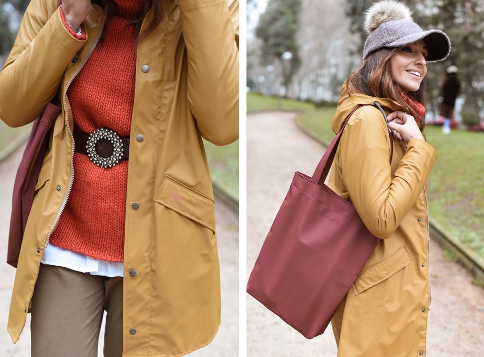Las prendas rojas son este jersey de cuello alto de GRLFRND de la web Revolve, las botas de agua de Igor y este bolso impermeable también de Cormorant. El resto del look es este chubasquero mostaza de Cormorant, cinturón de Nona BCN y pantalones de Massimo Dutti.